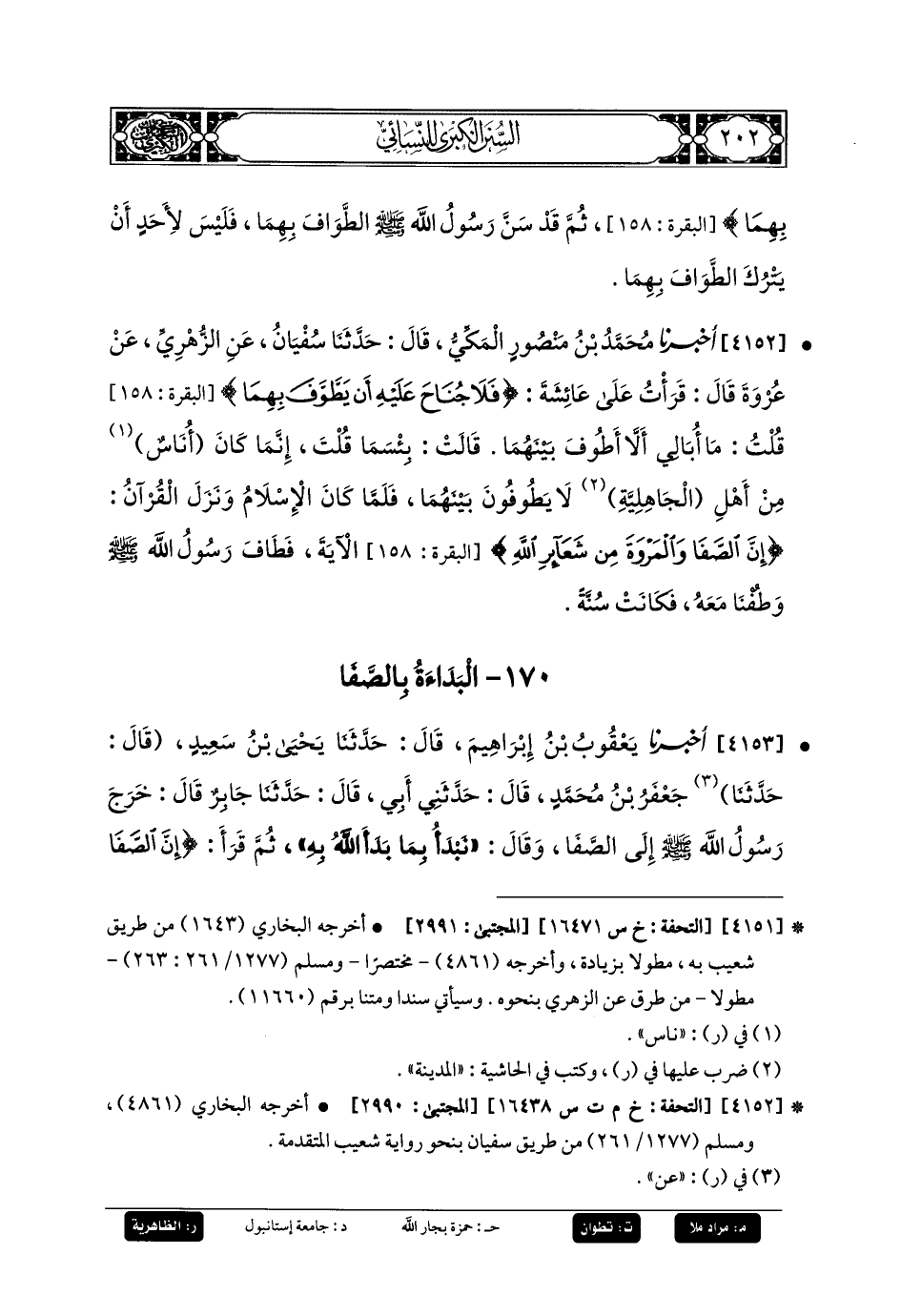 4152- أَخبَرنا مُحَمدُ بنُ مَنْصُورٍ المَكِّيُّ، قَالَ: حَدَّثنا سُفيانُ، عَنِ الزُّهْرِيِّ، عَن عُرْوَةَ، قَالَ: قَرَأْتُ عَلَى عَائِشَةَ: {فَلا جُنَاحَ عَلَيْهِ أَنْ يَطَّوَّفَ بِهِمَا} قُلْتُ: مَا أُبَالِي أَنْ لا أَطُوفَ بَيْنَهُمَا، قَالَتْ: بِئْسَمَا قُلْتَ، إِنَّمَا كَانَ أُنَاسٌ مِنْ أَهْلِ الجَاهِلِيَّةِ لا يَطُوفُونَ بَيْنَهُمَا، فَلَمَّا كَانَ الإِسلامُ وَنَزَلَ القُرْآنُ: {إِنَّ الصَّفَا وَالمَرْوَةَ مِنْ شَعَائِرِ اللهِ} الآيَةَ، فَطَافَ رَسُولُ اللهِ صَلى الله عَليه وسَلم وَطُفْنَا مَعَهُ، فَكَانَتْ سُنَّةً.