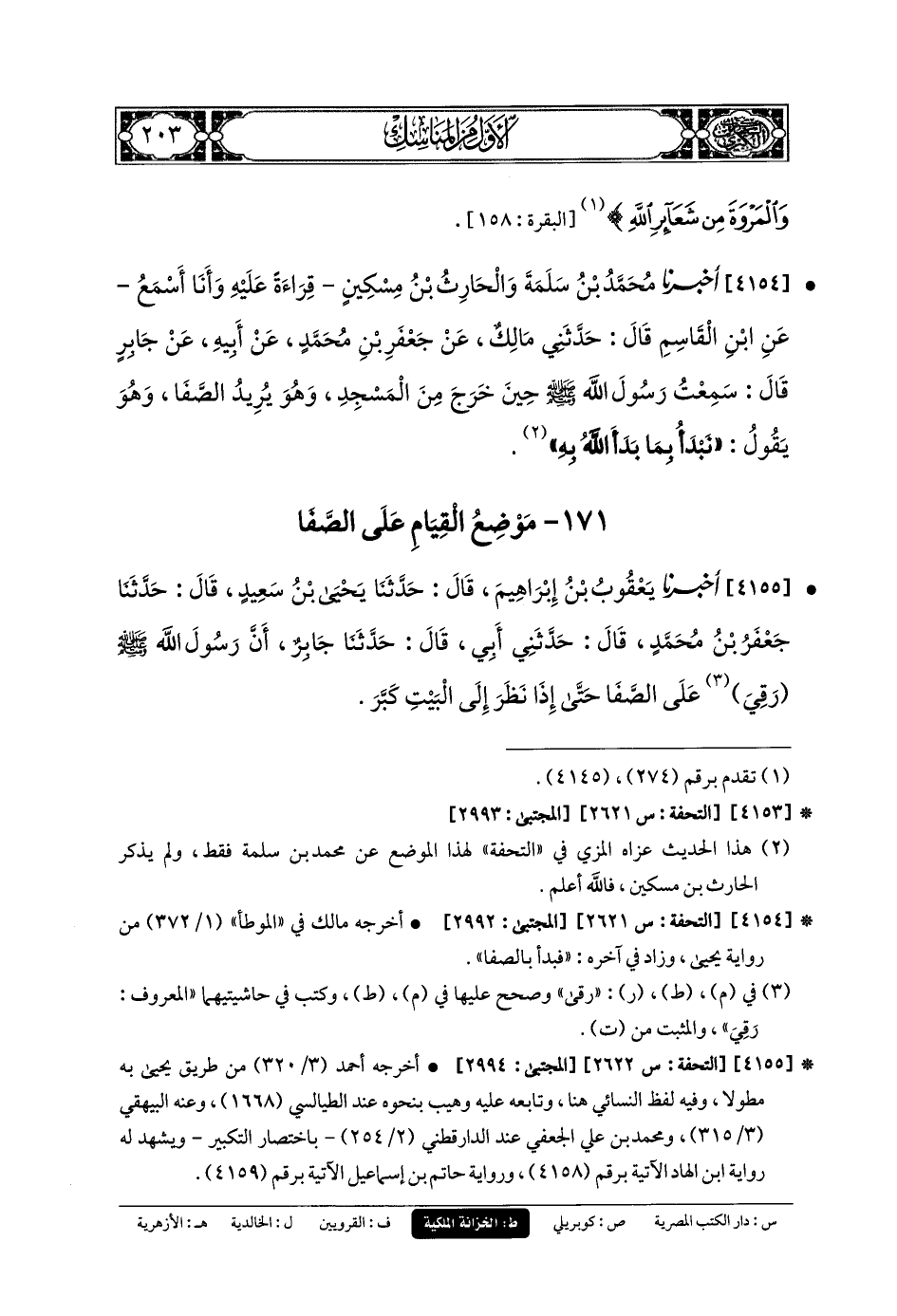 4154- أَخبَرنا مُحَمدُ بنُ سَلَمَةَ، وَالحَارِثُ بنُ مِسْكِينٍ، قِرَاءَةً عَلَيْهِ، وَأَنَا أَسْمَعُ، عَنِ ابنِ القَاسِمِ، قَالَ: حَدَّثني مَالِكٌ، عَن جَعفَرِ بنِ مُحَمدٍ، عَن أَبيهِ، عَن جَابِرٍ، قَالَ: سَمِعْتُ رَسُولَ اللهِ صَلى الله عَليه وسَلم حِينَ خَرَجَ مِنَ المَسْجِدِ وَهُوَ يُرِيدُ الصَّفَا وَهُوَ يَقُولُ: نَبْدَأُ بِمَا بَدَأَ اللهُ بِهِ.
