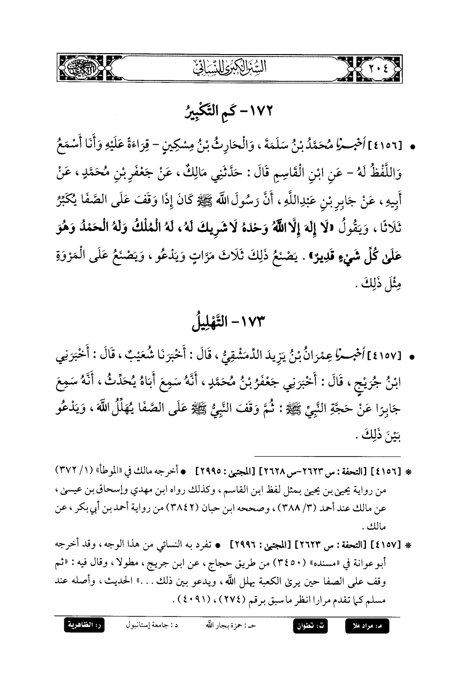 4156- أَخبَرنا مُحَمدُ بنُ سَلَمَةَ، وَالحَارِثُ بنُ مِسْكِينٍ، قِرَاءَةً عَلَيْهِ، وَأَنَا أَسْمَعُ، وَاللَّفْظُ لَهُ، عَنِ ابنِ القَاسِمِ، قَالَ: حَدَّثني مَالِكٌ، عَن جَعفَرِ بنِ مُحَمدٍ، عَن أَبيهِ، عَن جَابِرِ بنِ عَبدِ اللهِ، أَنَّ رَسُولَ اللهِ صَلى الله عَليه وسَلم كَانَ إِذَا وَقَفَ عَلَى الصَّفَا يُكَبِّرُ ثَلاثًا وَيَقُولُ: لا إِلَهَ إِلاَّ اللهُ وَحْدَهُ لا شَرِيكَ لَهُ، لَهُ المُلْكُ، وَلَهُ الحَمْدُ، وَهُوَ عَلَى كُلِّ شَيْءٍ قَدِيرٌ، يَصْنَعُ ذَلِكَ ثَلاثَ مَرَّاتٍ وَيَدْعُو، وَيَصْنَعُ عَلَى المَرْوَةِ مِثْلَ ذَلِكَ.