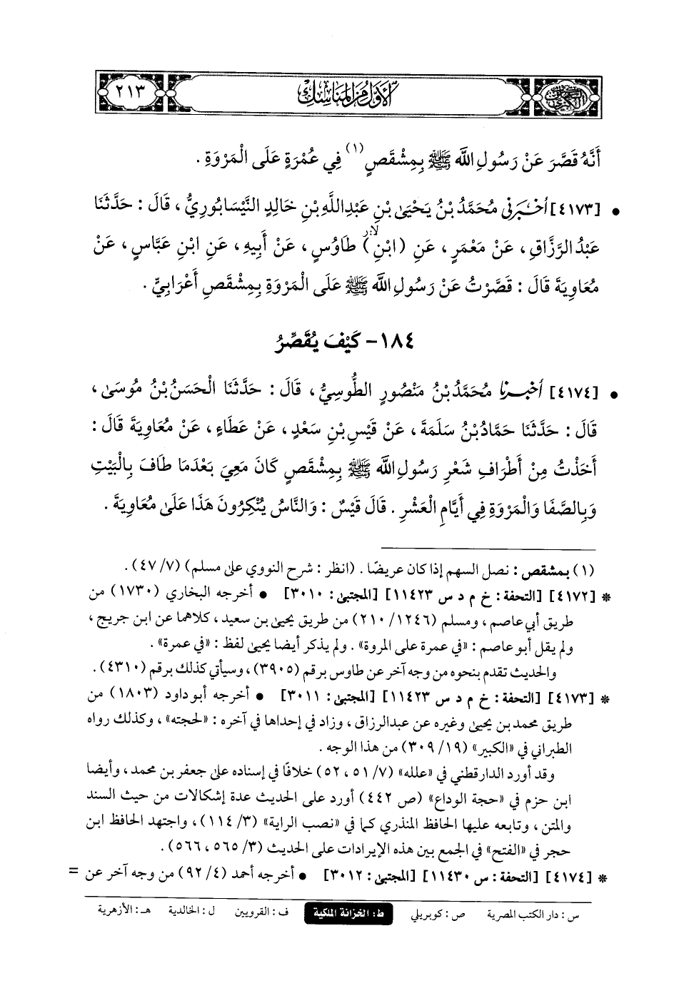 4173- أَخبَرني مُحَمدُ بنُ يَحيَى بنِ عَبدِ اللهِ بنِ خَالِدٍ النَّيْسَابُورِيُّ، قَالَ: حَدَّثنا عَبدُ الرَّزَّاقِ، عَن مَعْمَرٍ، عَنِ ابنِ طَاوُوسٍ، عَن أَبيهِ، عَنِ ابنِ عَبَّاسٍ، عَن مُعاويَةَ، قَالَ: قَصَّرْتُ عَن رَسُولِ اللهِ صَلى الله عَليه وسَلم عَلَى المَرْوَةِ بِمِشْقَصِ أَعْرَابِيٍّ.