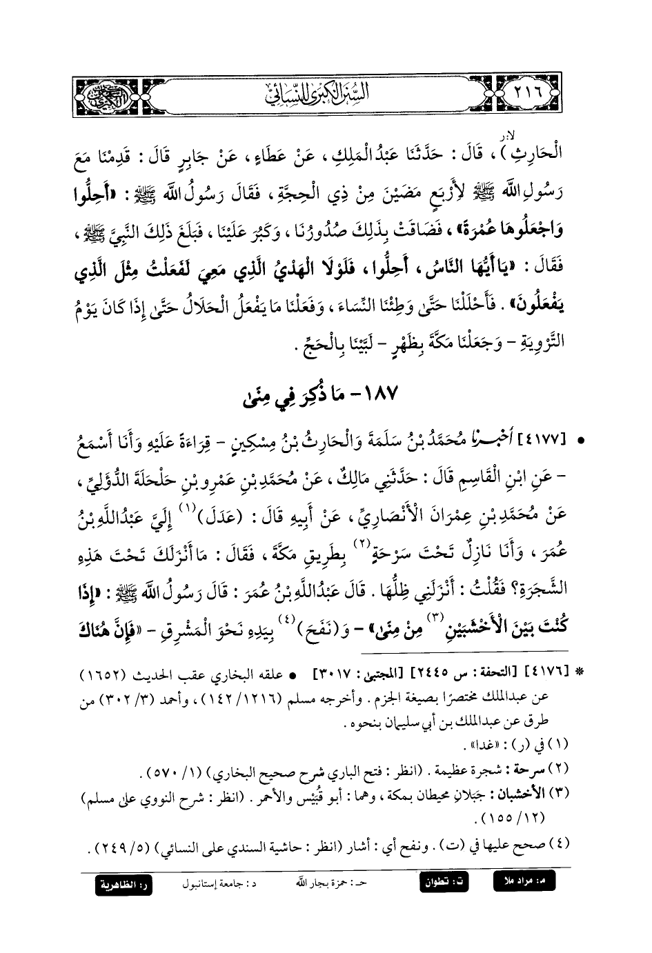 4177- أَخبَرنا مُحَمدُ بنُ سَلَمَةَ، وَالحَارِثُ بنُ مِسْكِينٍ، قِرَاءَةً عَلَيْهِ، وَأَنَا أَسْمَعُ، عَنِ ابنِ القَاسِمِ، قَالَ: حَدَّثني مَالِكٌ، عَن مُحَمدِ بنِ عَمْرِو بنِ حَلْحَلَةَ الدُّؤَلِيِّ، عَن مُحَمدِ بنِ عِمْرَانَ الأَنْصَارِيِّ، عَن أَبيهِ، قَالَ: عدل إِلَيَّ عَبدُ اللهِ بنُ عُمَرَ، وَأَنَا نَازِلٌ تَحْتَ سَرْحَةٍ بِطَرِيقِ مَكَّةَ، فَقَالَ: مَا أَنْزَلَكَ تَحْتَ هَذِهِ الشَّجَرَةِ؟ فَقُلْتُ: أَنْزَلَنِي ظِلُّهَا، قَالَ عَبدُ اللهِ بنُ عُمَرَ، قَالَ رَسُولُ اللهِ صَلى الله عَليه وسَلم: إِذَا كُنْتَ بَيْنَ الأَخْشَبَيْنِ مِنْ مِنًى، وَنَفَحَ بِيَدِهِ نَحْوَ المَشْرِقِ، فَإِنَّ هُنَاكَ وَادِيًا يُقَالُ لَهُ: السربد، فِي حَدِيثِ الحَارِثِ، يُقَالُ لَهُ: السُّرَرُ، بِهِ سَرْحَةٌ سُرَّ تَحْتَهَا سَبْعُونَ نَبِيًّا.
