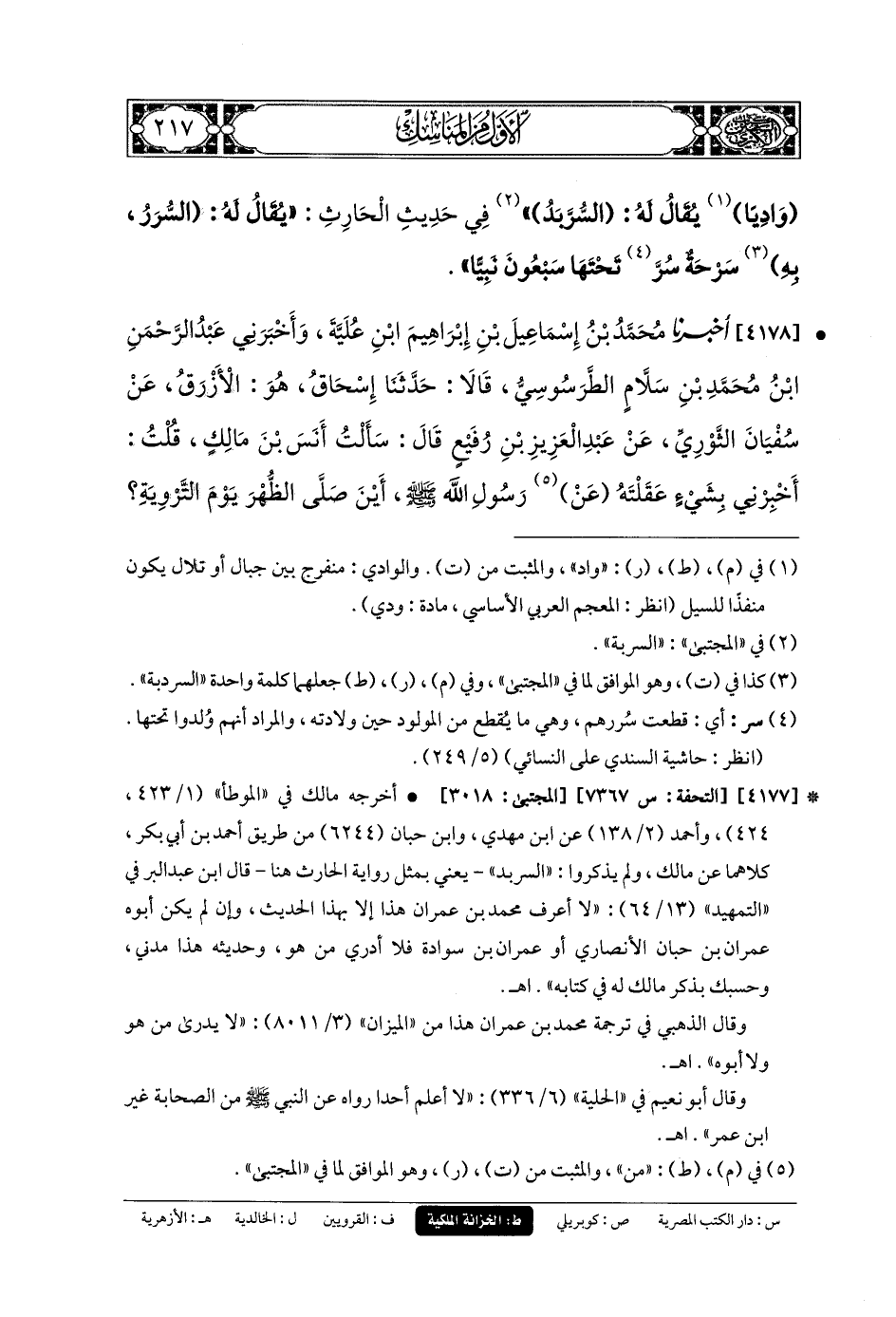 4178- أَخبَرنا مُحَمدُ بنُ إِسمَاعِيلَ بنِ إِبرَاهِيمَ ابنِ عُلَيَّةَ، وَأَخبَرني عَبدُ الرَّحمَنِ بنُ مُحَمدِ بنِ سَلاَّمٍ الطَّرَسُوسِيُّ، قَالا: حَدَّثنا إِسحَاقُ، هُوَ الأَزْرَقُ، عَن سُفيانَ الثَّوْرِيِّ، عَن عَبدِ العَزِيزِ بنِ رُفَيْعٍ، قَالَ: سَأَلْتُ أَنَسَ بْنَ مَالِكٍ، قُلْتُ: أَخبَرني بِشَيْءٍ عَقَلْتَهُ مِنْ رَسُولِ اللهِ صَلى الله عَليه وسَلم، أَيْنَ صَلَّى الظُّهْرَ يَوْمَ التَّرْوِيَةِ؟ قَالَ، بِمِنًى، قُلْتُ: فَأَيْنَ صَلَّى العَصْرَ يَوْمَ النَّفْرِ؟ قَالَ: بِالأَبْطَحِ.