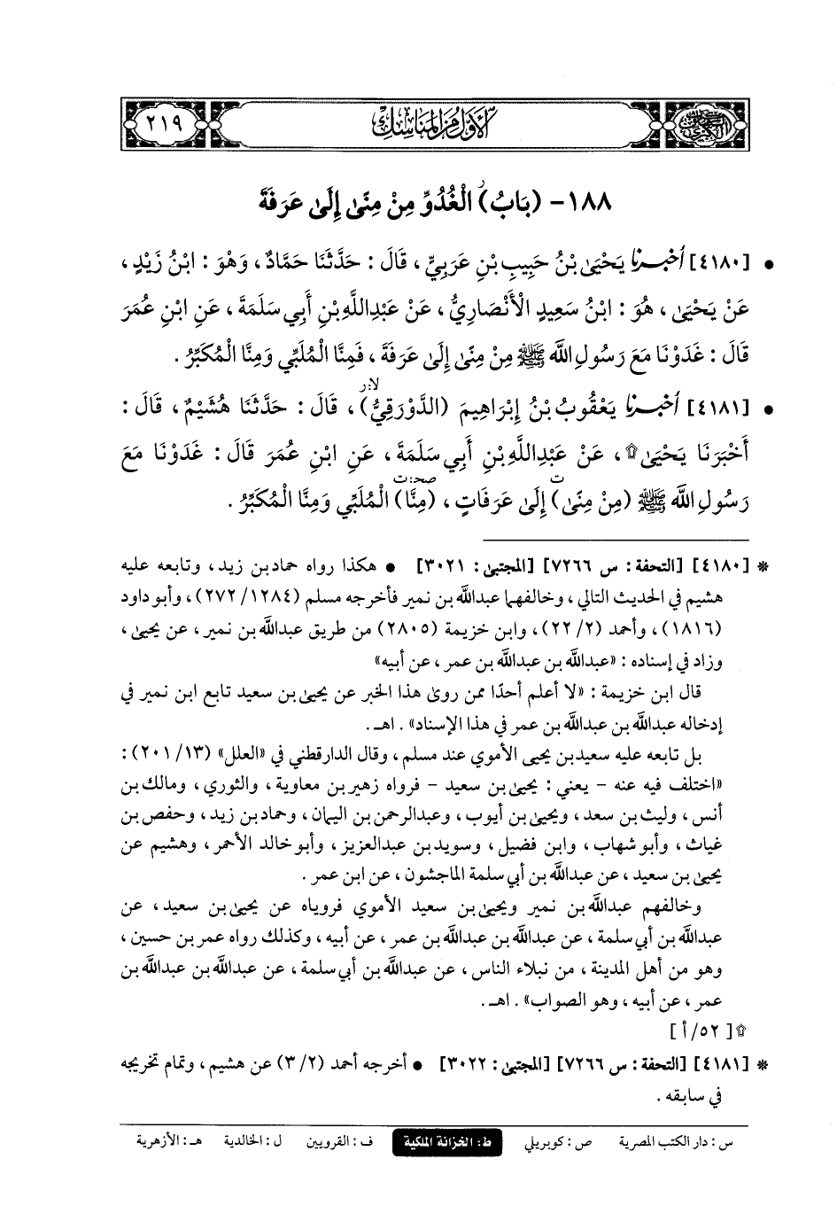 4180- أَخبَرنا يَحيَى بنُ حَبِيبِ بنِ عَرَبِيٍّ، قَالَ: حَدَّثنا حَمَّادٌ، وَهُوَ ابْنُ زَيْدٍ، عَن يَحيَى، هُوَ ابْنُ سَعِيدٍ الأَنْصَارِيُّ، عَن عَبدِ اللهِ بنِ أَبي سَلَمَةَ، عَنِ ابنِ عُمَرَ، قَالَ: غَدَوْنَا مَعَ رَسُولِ اللهِ صَلى الله عَليه وسَلم مِنْ مِنًى إِلَى عَرَفَةَ فَمِنَّا المُلَبِّي، وَمِنَّا المُكَبِّرُ.