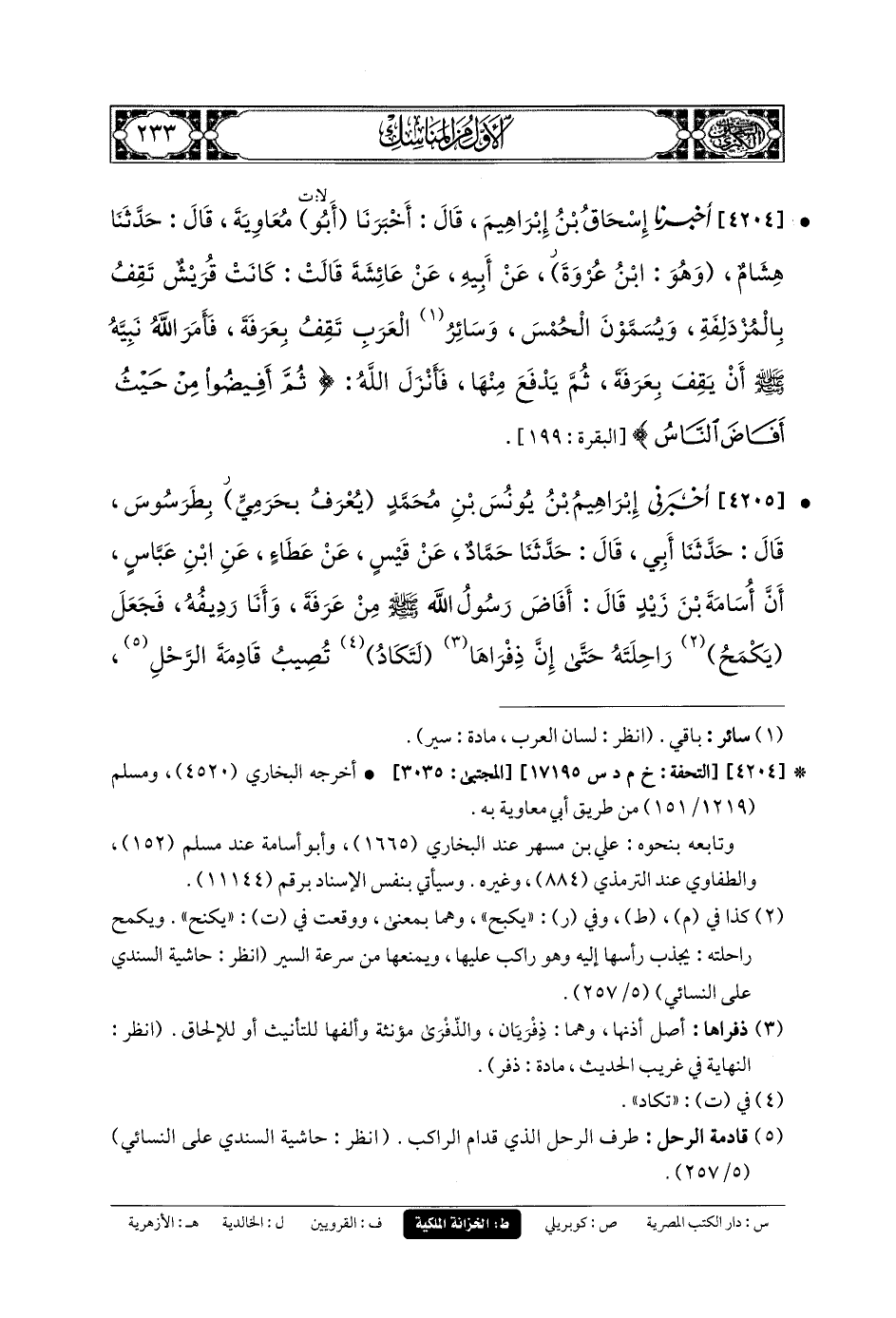 4204- أَخبَرنا إِسحَاقُ بنُ إِبرَاهِيمَ، قَالَ: أَخبَرنا أَبو مُعاويَةُ، قَالَ: حَدَّثنا هِشَامٌ، وَهُوَ ابْنُ عُرْوَةَ، عَن أَبيهِ، عَن عَائِشَةَ، قَالَتْ: كَانَتْ قُرَيْشٌ تَقِفُ بِالمُزْدَلِفَةِ وَيُسَمَّوْنَ الحُمْسَ، وَسَائِرُ العَرَبِ تَقْفُ بِعَرَفَةَ، فَأَمَرَ اللهُ نَبِيَّهُ صَلى الله عَليه وسَلم أَنْ يَقِفَ بِعَرَفَةَ، ثُمَّ يَدْفَعَ مِنْهَا، فَأَنْزَلَ اللهُ: {ثُمَّ أَفِيضُوا مِنْ حَيْثُ أَفَاضَ النَّاسُ}.