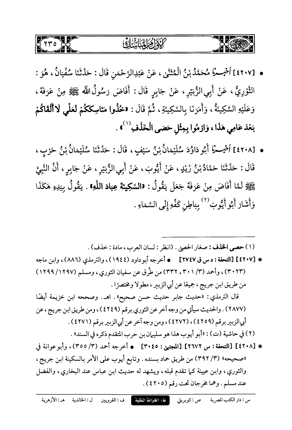 4208- أَخبَرنا أَبو دَاوُدَ سُلَيمَانُ بنُ سَيْفٍ، قَالَ: حَدَّثنا سُلَيمَانُ بنُ حَرْبٍ، قَالَ: حَدَّثنا حَمَّادُ بنُ زَيْدٍ، عَن أَيوبَ، عَن أَبي الزُّبَيْرِ، عَن جَابِرٍ، أَنَّ النَّبيَّ صَلى الله عَليه وسَلم لَمَّا أَفَاضَ مِنْ عَرَفَةَ جَعَلَ يَقُولُ: السَّكِينَةَ عِبَادَ اللهِ، يَقُولُ بِيَدِهِ.