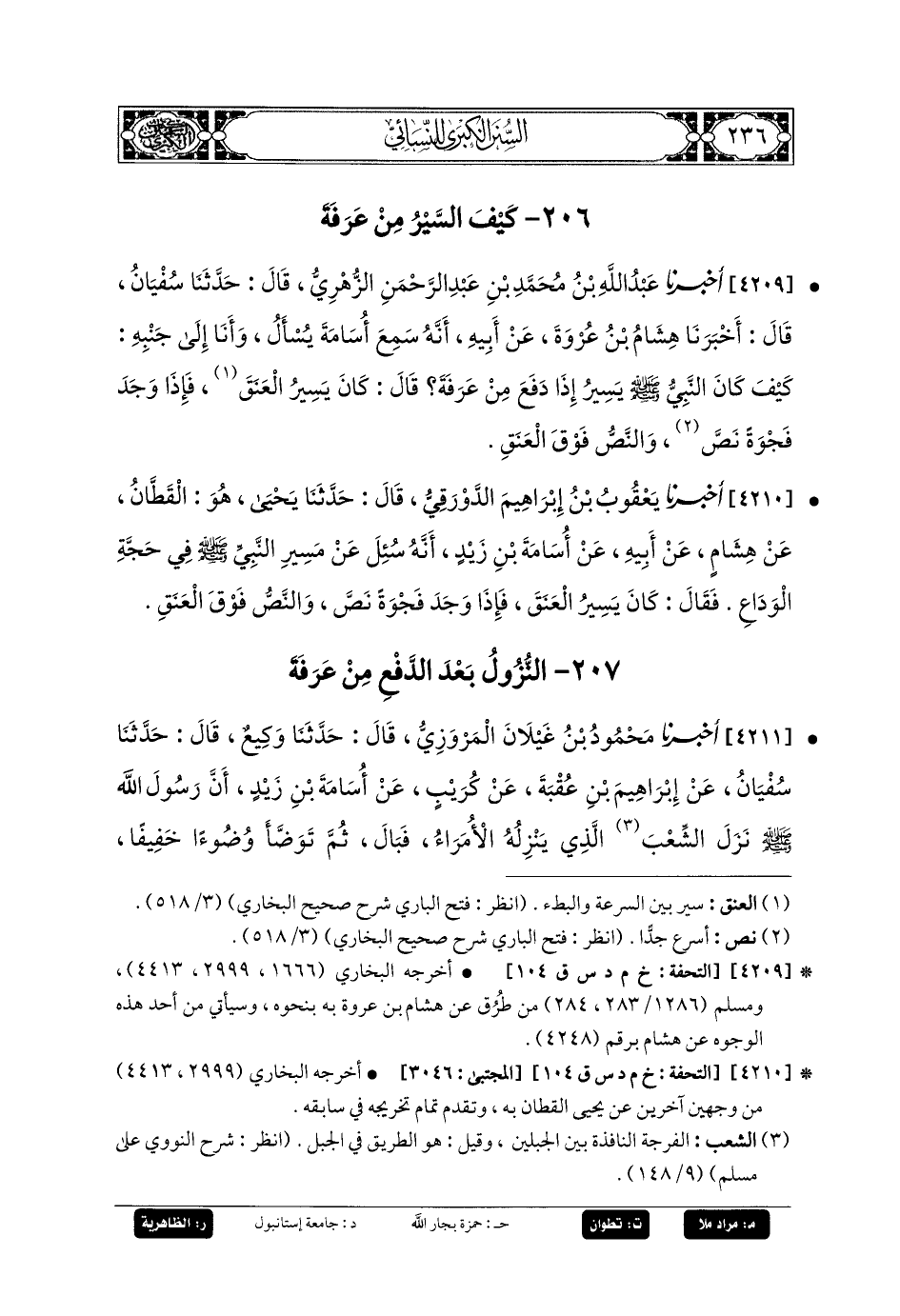 4209- أَخبَرنا عَبدُ اللهِ بنُ مُحَمدِ بنِ عَبدِ الرَّحمَنِ الزُّهْرِيُّ، قَالَ: حَدَّثنا سُفيانُ، قَالَ: أَخبَرنا هِشَامُ بنُ عُرْوَةَ، عَن أَبيهِ، أَنَّهُ سَمِعَ أُسَامَةَ يُسْأَلُ وَأَنَا جَنْبَهُ: كَيْفَ كَانَ النَّبيُّ صَلى الله عَليه وسَلم يَسِيرُ إِذَا دَفَعَ مِنْ عَرَفَةَ؟ قَالَ: كَانَ يَسِيرُ العَنَقَ، فَإِذَا وَجَدَ فَجْوَةً نَصَّ، وَالنَّصُّ فَوْقَ العَنَقِ.