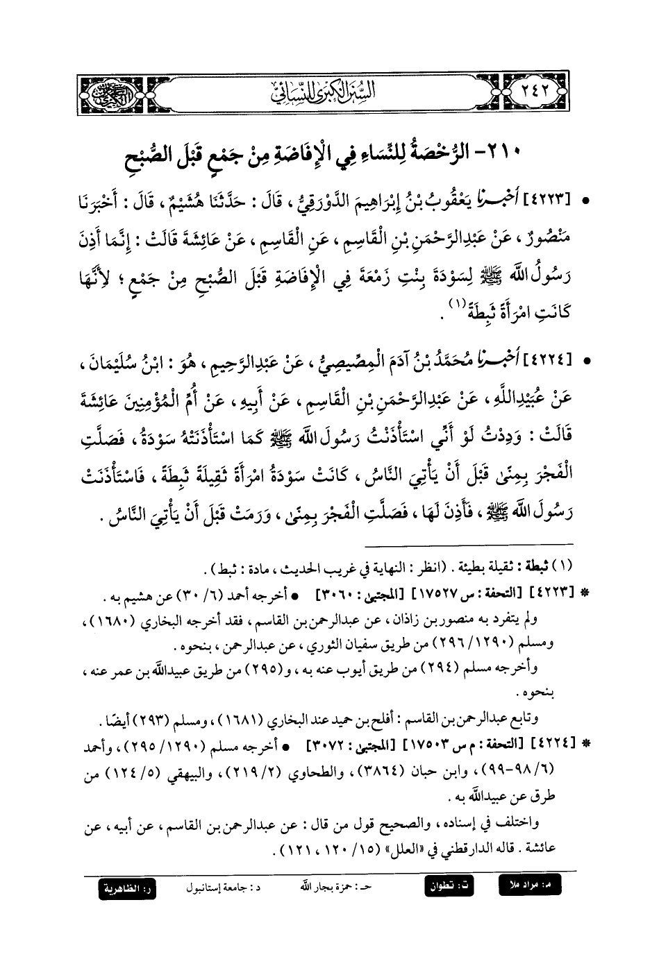 4224- أَخبَرنا مُحَمدُ بنُ آدَمَ المِصِّيصِيُّ، عَن عَبدِ الرَّحِيمِ، هُوَ ابْنُ سُلَيمَانَ، عَن عُبَيدِ اللهِ، عَن عَبدِ الرَّحمَنِ بنِ القَاسِمِ، عَن أَبيهِ، عَن أُمِّ المُؤْمِنِينَ عَائِشَةَ، قَالَتْ: وَدِدْتُ لَوْ أَنِّي اسْتَأْذَنْتُ رَسُولَ اللهِ صَلى الله عَليه وسَلم كَمَا اسْتَأْذَنَتْهُ سَوْدَةُ، فَصَلَّتِ الفَجْرَ بِمِنًى قَبْلَ أَنْ يَأْتِيَ النَّاسُ، كَانَتْ سَوْدَةُ امْرَأَةً ثَقِيلَةً ثَبِطَةً، فَاسْتَأْذَنَتْ رَسُولَ اللهِ صَلى الله عَليه وسَلم، فَأَذِنَ لَهَا، فَصَلَّتِ الفَجْرَ بِمِنًى، وَرَمَتْ قَبْلَ أَنْ يَأْتِيَ النَّاسُ.