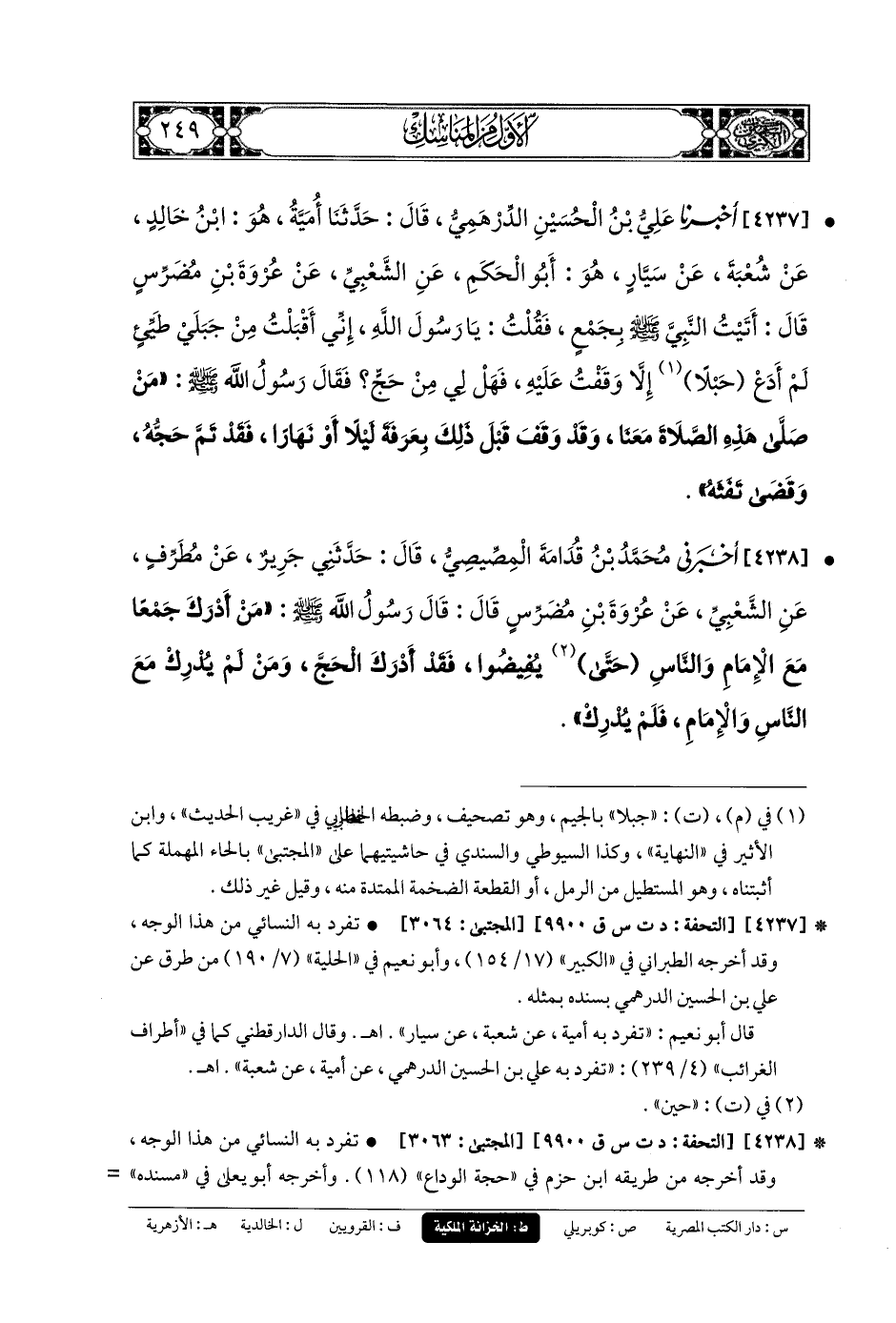 4238- أَخبَرني مُحَمدُ بنُ قُدَامَةَ المِصِّيصِيُّ، قَالَ: حَدَّثني جَرِيرٌ، عَن مُطَرِّفٍ، عَنِ الشَّعْبِيِّ، عَن عُرْوَةَ بنِ مُضَرِّسٍ، قَالَ: قَالَ رَسُولُ اللهِ صَلى الله عَليه وسَلم: مَنْ أَدْرَكَ جَمْعًا مَعَ الإِمَامِ وَالنَّاسِ حَتَّى يُفِيضُوا فَقَدْ أَدْرَكَ الحَجَّ، وَمَنْ لَمْ يُدْرِكْ مَعَ النَّاسِ وَالإِمَامِ فَلَمْ يُدْرِكْ.