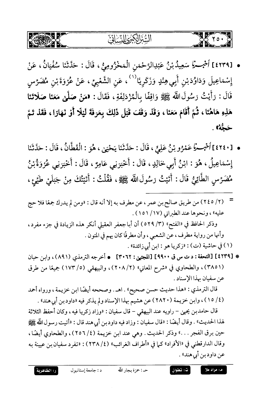 4239- أَخبَرنا سَعِيدُ بنُ عَبدِ الرَّحمَنِ أَبو عُبَيدِ اللهِ المَخْزُومِيُّ، قَالَ: حَدَّثنا سُفيانُ، عَن إِسمَاعِيلَ، وَدَاوُدَ بنِ أَبي هِنْدٍ، وَزَكَرِيَّا، عَنِ الشَّعْبِيِّ، عَن عُرْوَةَ بنِ مُضَرِّسٍ، قَالَ: رَأَيْتُ رَسُولَ اللهِ صَلى الله عَليه وسَلم وَاقِفًا بِالمُزْدَلِفَةِ، فَقَالَ: مَنْ صَلَّى مَعَنَا صَلاتَنَا هَذِهِ هَاهُنَا، ثُمَّ أَقَامَ مَعَنَا، وَقَدْ وَقَفَ قَبْلَ ذَلِكَ بِعَرَفَةَ لَيْلاً أَوْ نَهَارًا، فَقَدْ تَمَّ حَجُّهُ.