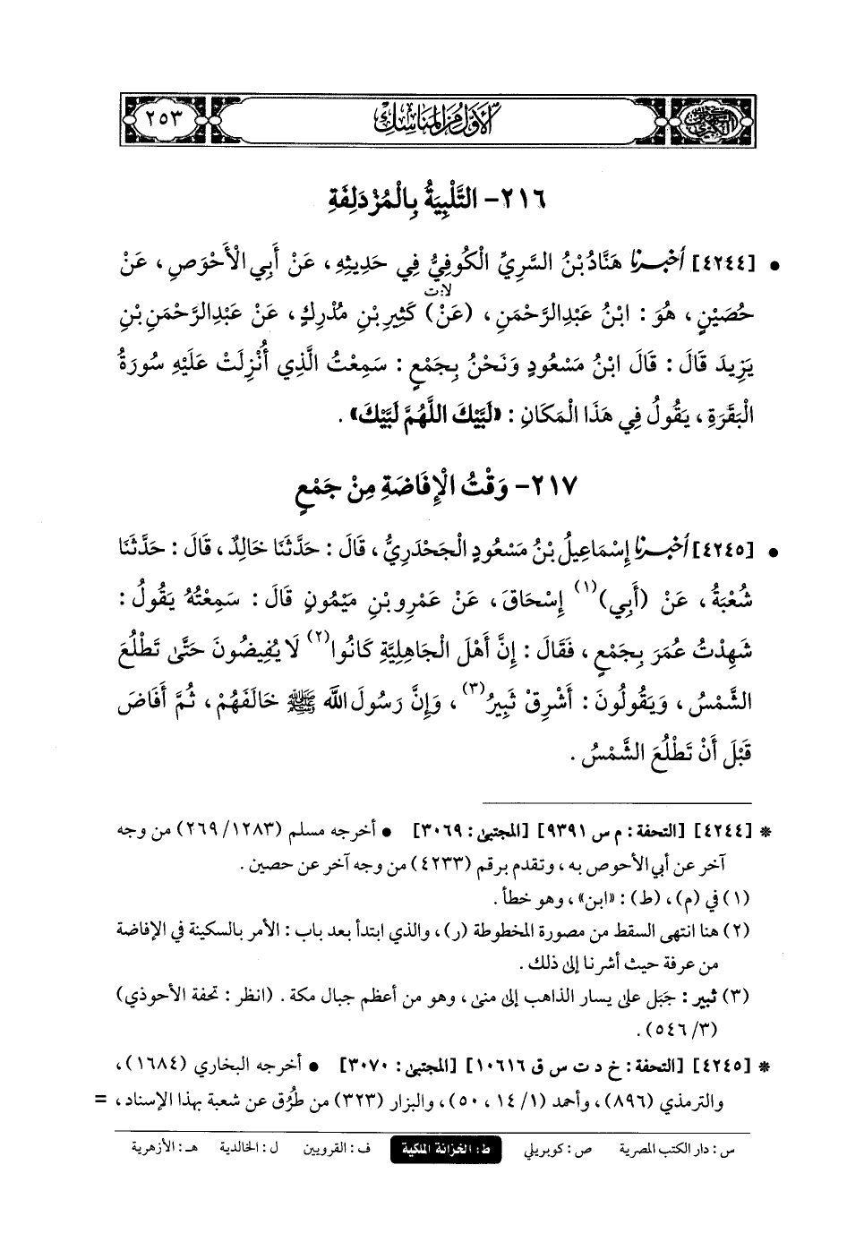 4244- أَخبَرنا هَنَّادُ بنُ السَّرِيِّ الكُوفِيُّ فِي حَدِيثِهِ، عَن أَبي الأَحْوَصِ، عَن حُصَيْنٍ، هُوَ ابْنُ عَبدِ الرَّحمَنِ، عَن كَثِيرِ بنِ مُدْرِكٍ، عَن عَبدِ الرَّحمَنِ بنِ يَزِيدَ، قَالَ: قَالَ ابْنُ مَسْعُودٍ وَنَحْنُ بِجَمْعٍ: سَمِعْتُ الَّذِي أُنْزِلَتْ عَلَيْهِ سُورَةُ البَقَرَةِ يَقُولُ فِي هَذَا المَكَانِ: لَبَّيْكَ اللهُمَّ لَبَّيْكَ.