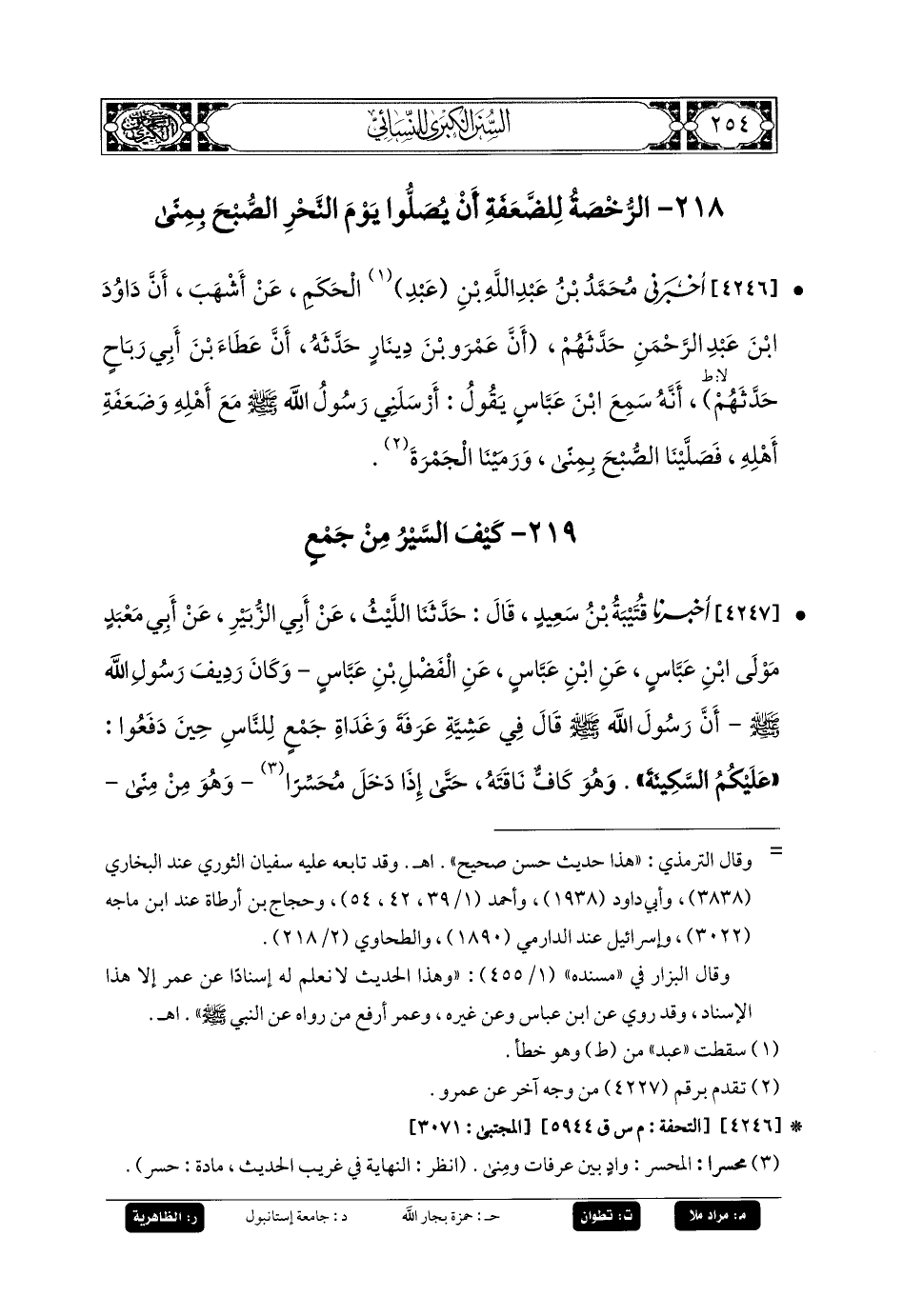 4247- أَخبَرنا قُتَيبَةُ بنُ سَعِيدٍ، قَالَ: حَدَّثنا اللَّيْثُ، عَن أَبي الزُّبَيْرِ، عَن أَبي مَعْبَدٍ، مَوْلَى ابنِ عَبَّاسٍ، عَنِ ابنِ عَبَّاسٍ، عَنِ الفَضْلِ بنِ عَبَّاسٍ، وَكَانَ رَدِيفَ رَسُولِ اللهِ صَلى الله عَليه وسَلم، أَنَّ رَسُولَ اللهِ صَلى الله عَليه وسَلم قَالَ فِي عَشِيَّةِ عَرَفَةَ وَغَدَاةَ جَمْعٍ لِلنَّاسِ حِينَ دَفَعُوا: عَلَيْكُمُ السَّكِينَةَ، وَهُوَ كَافٌ نَاقَتَهُ، حَتَّى إِذَا دَخَلَ مُحَسِّرًا وَهُوَ مِنْ مِنًى قَالَ: عَلَيْكُمْ بِحَصَى الخَذْفِ الَّذِي تُرْمَى بِهِ الجَمْرَةُ، لَمْ يَزَلْ رَسُولُ اللهِ صَلى الله عَليه وسَلم يُلَبِّي حَتَّى رَمَى الجَمْرَةَ.