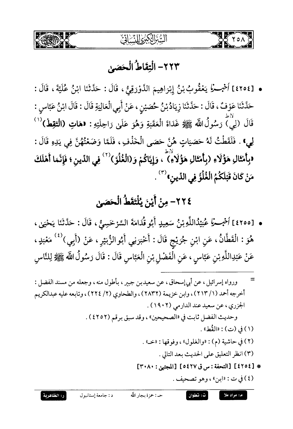 4254- أَخبَرنا يَعقُوبُ بنُ إِبرَاهِيمَ الدَّوْرَقِيُّ، قَالَ: حَدَّثنا ابْنُ عُلَيَّةَ، قَالَ: حَدَّثنا عَوْفٌ، قَالَ: حَدَّثنا زِيَادُ بنُ حُصَيْنٍ، عَن أَبي العَالِيَةِ، قَالَ: قَالَ ابْنُ عَبَّاسٍ: قَالَ لِي رَسُولُ اللهِ صَلى الله عَليه وسَلم غَدَاةَ العَقَبَةِ وَهُوَ عَلَى رَاحِلَتِهِ: هَاتِ التَقِطْ لِي، فَلَقَطْتُ لَهُ حَصَيَاتٍ هُنَّ حَصَى الخَذْفِ، فَلَمَّا وَضَعْتُهُنَّ فِي يَدِهِ، قَالَ: بِأَمْثَالِ هَؤُلاءِ، بِأَمْثَالِ هَؤُلاءِ، وَإِيَّاكُمْ وَالغُلُوَّ فِي الدِّينِ، فَإِنَّمَا أَهْلَكَ مَنْ قِبْلَكُمُ الغُلُوُّ فِي الدِّينِ.