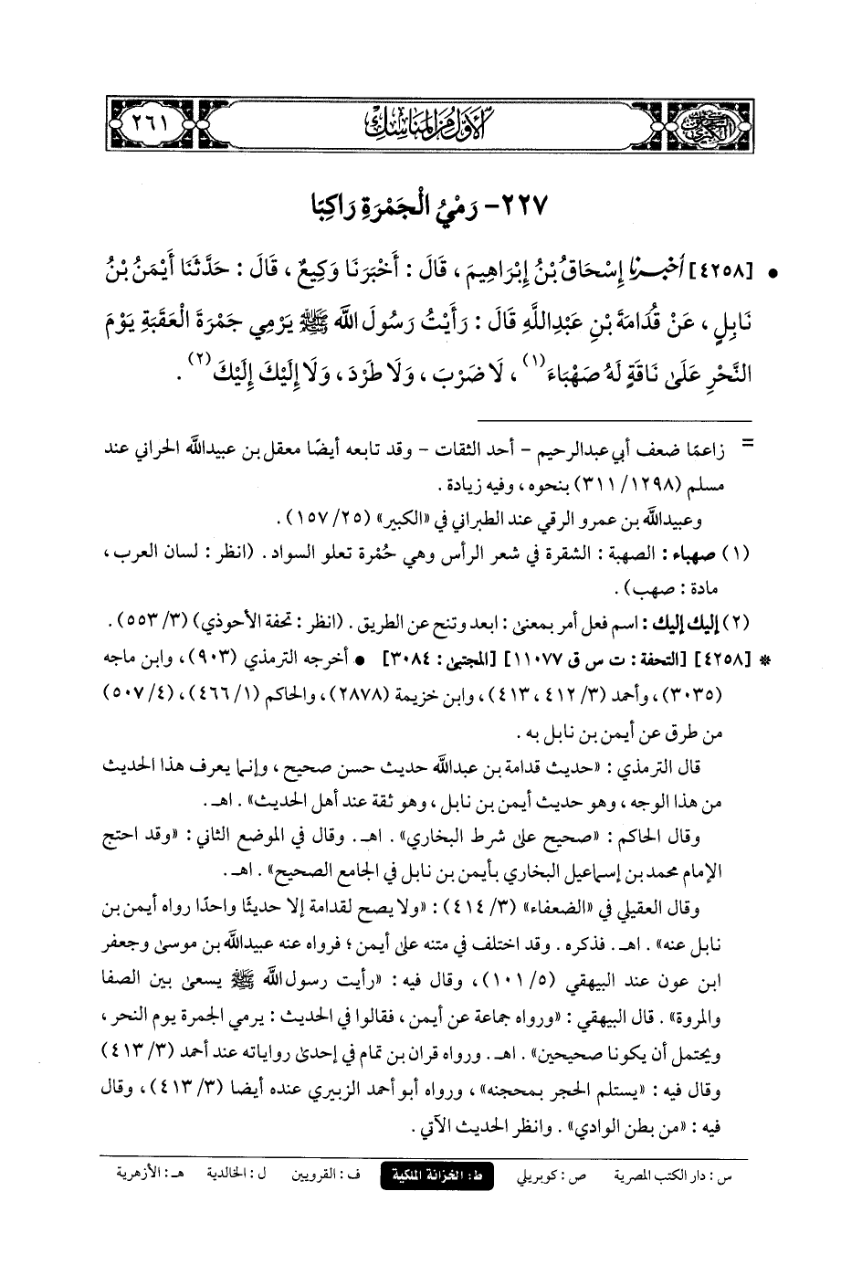 4258- أَخبَرنا إِسحَاقُ بنُ إِبرَاهِيمَ، قَالَ: أَخبَرنا وَكِيعٌ، قَالَ: حَدَّثنا أَيْمَنُ بنُ نَابِلٍ، عَن قُدَامَةَ بنِ عَبدِ اللهِ، قَالَ: رَأَيْتُ رَسُولَ اللهِ صَلى الله عَليه وسَلم يَرْمِي جَمْرَةَ العَقَبَةِ يَوْمَ النَّحْرِ عَلَى نَاقَةٍ لَهُ صَهْبَاءَ لا ضَرْبَ، وَلا طَرْدَ، وَلا إِلَيْكَ إِلَيْكَ.