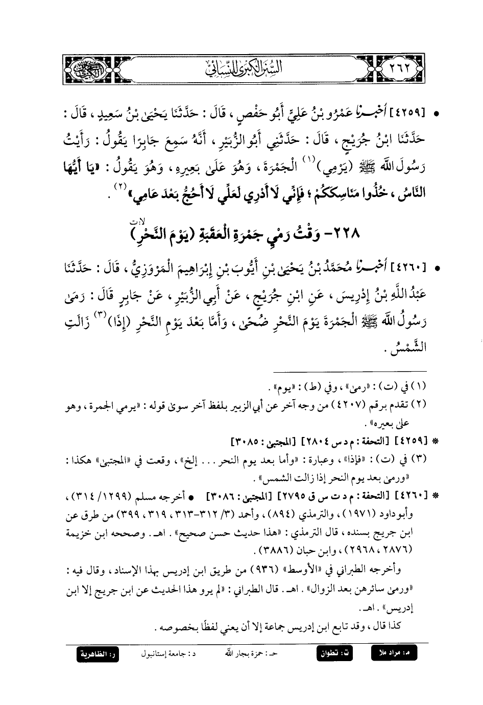 4259- أَخبَرنا عَمرُو بنُ عَليٍّ أَبو حَفْصٍ، قَالَ: حَدَّثنا يَحيَى بنُ سَعِيدٍ، قَالَ: حَدَّثنا ابْنُ جُرَيْجٍ، قَالَ: حَدَّثني أَبو الزُّبَيْرِ، أَنَّهُ سَمِعَ جَابِرًا، يَقُولُ: رَأَيْتُ رَسُولَ اللهِ صَلى الله عَليه وسَلم يَرْمِي الجَمْرَةَ، وَهُوَ عَلَى بَعِيرِهِ، وَهُوَ يَقُولُ: يَا أَيُّهَا النَّاسُ خُذُوا مَنَاسِكَكُمْ، فَإِنِّي لا أَدْرِي لِعَلِّي لا أَحُجُّ بَعْدَ عَامِي.
