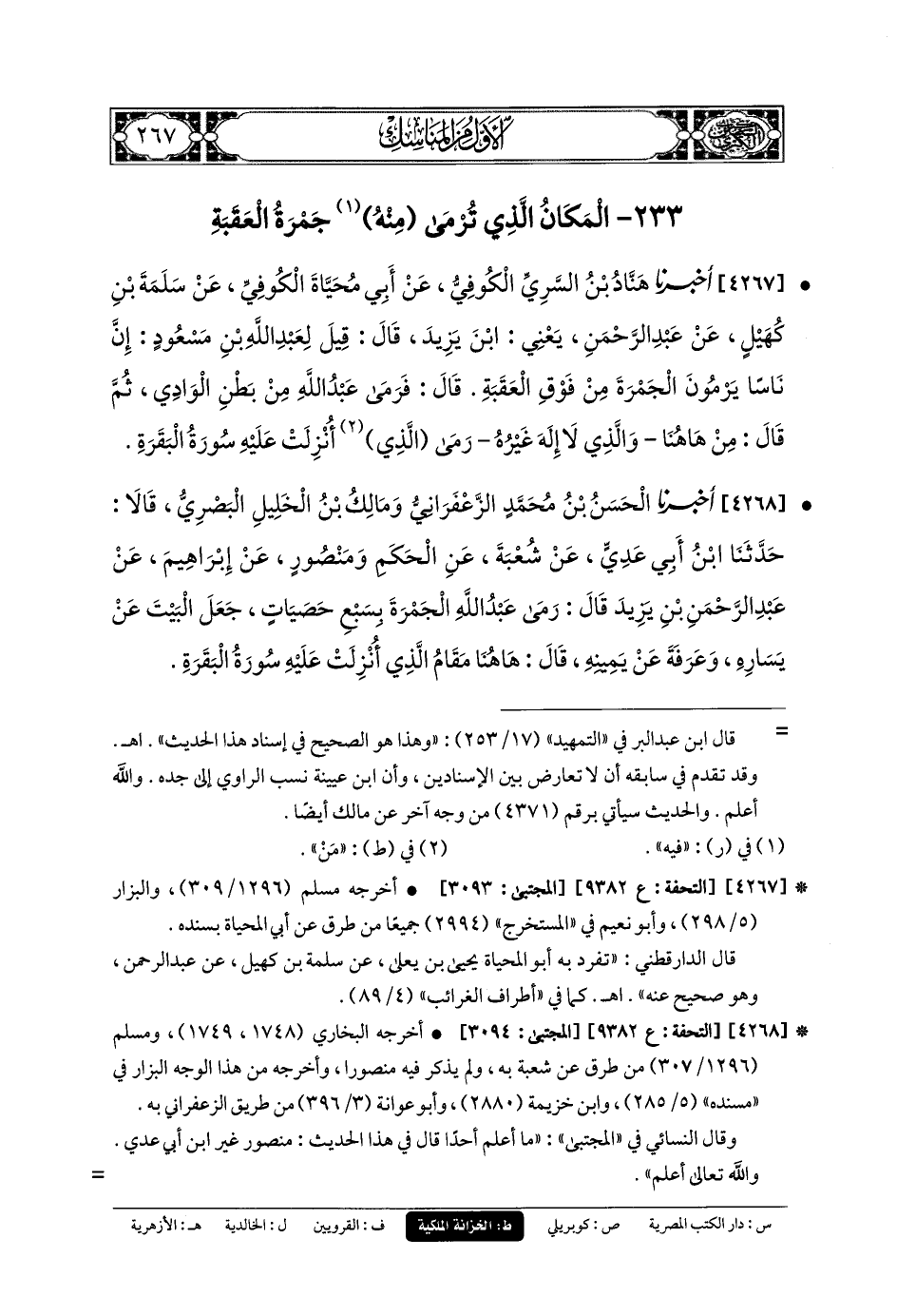4267- أَخبَرنا هَنَّادُ بنُ السَّرِيِّ الكُوفِيُّ، عَن أَبي مُحَيَّاةَ الكُوفِيِّ، عَن سَلَمَةَ بنِ كُهَيْلٍ، عَن عَبدِ الرَّحمَنِ، يَعْنِي ابْنَ يَزِيدَ، قَالَ: قِيلَ لِعَبدِ اللهِ بنِ مَسْعُودٍ: إِنَّ نَاسًا يَرْمُونَ الجَمْرَةَ مِنْ فَوْقِ العَقَبَةِ، قَالَ: فَرَمَى عَبدُ اللهِ مِنْ بَطْنِ الوَادِي، ثُمَّ قَالَ: مِنْ هَاهُنَا وَالَّذِي لا إِلَهَ غَيْرُهُ رَمَى الَّذِي أُنْزِلَتْ عَلَيْهِ سُورَةُ البَقَرَةِ.
