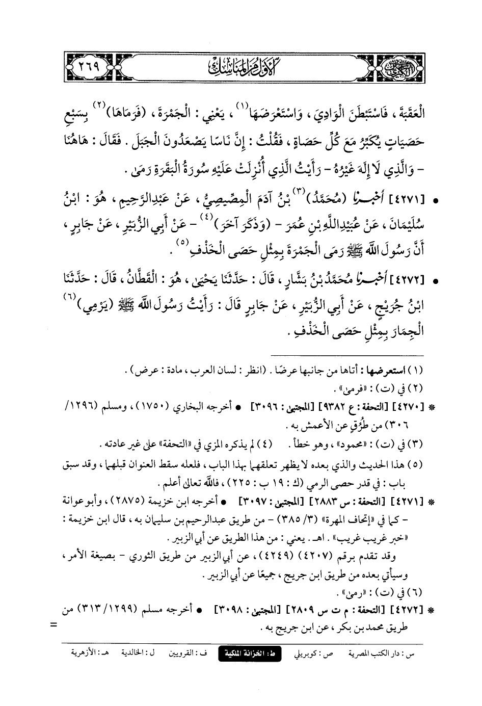 4272- أَخبَرنا مُحَمدُ بنُ بَشَّارٍ، قَالَ: حَدَّثنا يَحيَى، هُوَ القَطَّانُ، قَالَ: حَدَّثنا ابْنُ جُرَيْجٍ، عَن أَبي الزُّبَيْرِ، عَن جَابِرٍ، قَالَ: رَأَيْتُ رَسُولَ اللهِ صَلى الله عَليه وسَلم يَرْمِي الجِمَارَ بِمِثْلِ حَصَى الخَذْفِ.