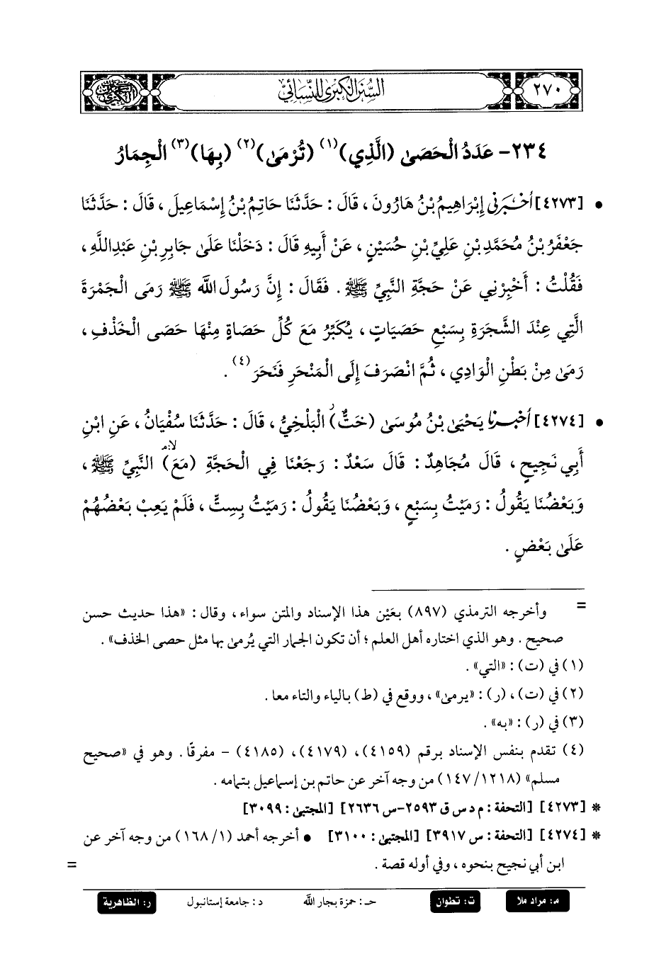 4273- أَخبَرني إِبرَاهِيمُ بنُ هَارُونَ، قَالَ: حَدَّثنا حَاتِمُ بنُ إِسمَاعِيلَ، قَالَ: حَدَّثنا جَعفَرُ بنُ مُحَمدِ بنِ عَليِّ بنِ حُسَيْنٍ، عَن أَبيهِ، قَالَ: دَخَلْنَا عَلَى جَابِرِ بنِ عَبدِ اللهِ، فَقُلْتُ: أَخْبِرْنِي عَن حَجَّةِ النَّبيِّ صَلى الله عَليه وسَلم فَقَالَ: إِنَّ رَسُولَ اللهِ صَلى الله عَليه وسَلم رَمَى الجَمْرَةَ الَّتِي عِنْدَ الشَّجَرَةِ بِسَبْعِ حَصَيَاتٍ يُكَبِّرُ مَعَ كُلِّ حَصَاةٍ مِنْهَا حَصَى الخَذْفِ، رَمَى مِنْ بَطْنِ الوَادِي، ثُمَّ انْصَرَفَ إِلَى المَنْحَرِ، فَنَحَرَ.