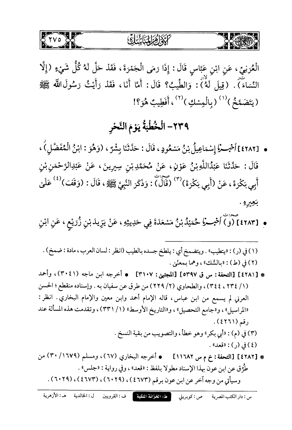 4282- أَخبَرنا إِسمَاعِيلُ بنُ مَسْعُودٍ، قَالَ: حَدَّثنا بِشْرٌ، وَهُوَ ابْنُ المُفَضَّلِ، قَالَ: حَدَّثنا عَبدُ اللهِ بنُ عَوْنٍ، عَن مُحَمدِ بنِ سِيرِينَ، عَن عَبدِ الرَّحمَنِ بنِ أَبي بَكْرَةَ، عَن أَبي بَكْرَةَ، قَالَ: وَذَكَرَ النَّبيَّ صَلى الله عَليه وسَلم قَالَ: وَقَفَ عَلَى بَعِيرِهِ.