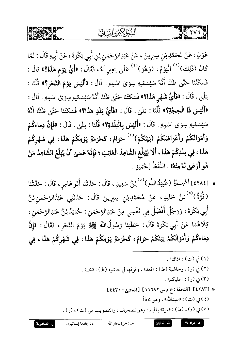 4284- أَخبَرنا عُبَيدُ اللهِ بنُ سَعِيدٍ، قَالَ: حَدَّثنا أَبو عَامِرٍ، قَالَ: حَدَّثنا قُرَّةُ بنُ خَالِدٍ، عَن مُحَمدِ بنِ سِيرِينَ، قَالَ: حَدَّثني عَبدُ الرَّحمَنِ بنُ أَبي بَكْرَةَ، وَرَجُلٌ أَفْضَلُ فِي نَفْسِي مِنْ عَبدِ الرَّحمَنِ حُمَيْدُ بنُ عَبدِ الرَّحمَنِ، كِلاهُمَا عَن أَبي بَكْرَةَ، قَالَ: خَطَبَنَا رَسُولُ اللهِ صَلى الله عَليه وسَلم يَوْمَ النَّحْرِ، فَقَالَ: إِنَّ دِمَاءَكُمْ وَأَمْوَالَكُمْ بَيْنَكُمْ حَرَامٌ كَحُرْمَةِ يَوْمِكُمْ هَذَا، فِي شَهْرِكُمْ هَذَا، فِي بَلَدِكُمْ هَذَا، إِلَى يَوْمِ تَلْقَوْنَ رَبِّكُمْ، أَلا هَلْ بَلَّغْتُ؟ قَالُوا: نَعَمْ، قَالَ: اللهُمَّ اشْهَدْ يُبَلِّغُ الشَّاهِدُ مِنْكُمُ الغَائِبَ، فَرُبَّ مُبَلَّغٍ أَوْعَى مِنْ سَامِعٍ، أَلا لا تَرْجِعُنَّ بَعْدِي كُفَّارًا، يَضْرِبُ بَعْضُكُمْ رِقَابَ بَعْضٍ.