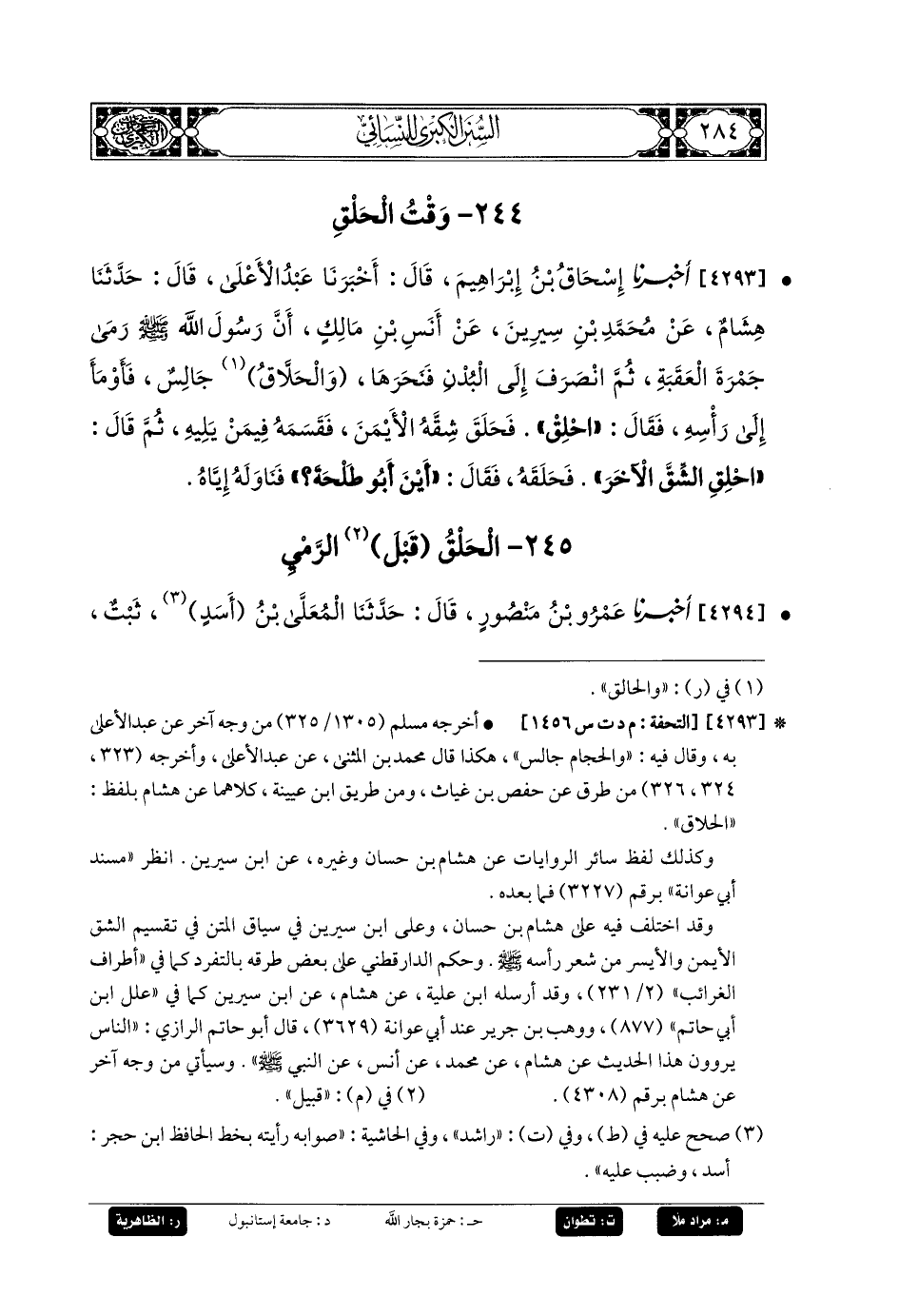 4293- أَخبَرنا إِسحَاقُ بنُ إِبرَاهِيمَ، قَالَ: أَخبَرنا عَبدُ الأَعْلَى، قَالَ: حَدَّثنا هِشَامٌ، عَن مُحَمدِ بنِ سِيرِينَ، عَن أَنَسِ بنِ مَالِكٍ، أَنَّ رَسُولَ اللهِ صَلى الله عَليه وسَلم رَمَى جَمْرَةَ العَقَبَةِ، ثُمَّ انْصَرَفَ إِلَى البُدْنِ فَنَحَرَهَا، وَالحَلاَّقُ جَالِسٌ، فَأَوْمَأَ إِلَى رَأْسِهِ، فَقَالَ: احْلِقْ، فَحَلَقَ شِقَّهَ الأَيْمَنَ، فَقَسَمَهُ فِيمَنْ يَلِيهِ، ثُمَّ قَالَ: احْلِقِ الشِّقَّ الآخَرَ، فَحَلَقَهُ فَقَالَ: أَيْنَ أَبو طَلْحَةَ، فَنَاوَلَهُ إِيَّاهُ.