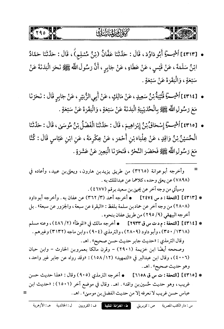 4313- أَخبَرنا أَبو دَاوُدَ، قَالَ: حَدَّثنا عَفَّانُ بنُ مُسْلِمٍ، قَالَ: حَدَّثنا حَمَّادُ بنُ سَلَمَةَ، عَن قَيسٍ، عَن عَطَاءٍ، عَن جَابِرٍ، أَنَّ رَسُولَ اللهِ صَلى الله عَليه وسَلم نَحَرَ البَدَنَةَ عَن سَبْعَةٍ، وَالبَقَرَةَ عَن سَبْعَةٍ.