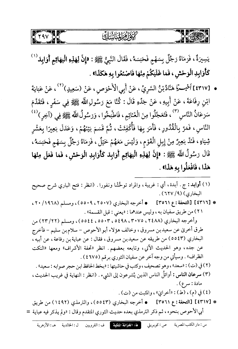 4317- أَخبَرنا هَنَّادُ بنُ السَّرِيِّ، عَن أَبي الأَحْوَصِ، عَن سَعِيدٍ، عَن عَبَايَةَ بنِ رِفَاعَةَ، عَن أَبيهِ، عَن جَدِّهِ، قَالَ: كُنَّا مَعَ رَسُولِ اللهِ صَلى الله عَليه وسَلم فِي سَفَرٍ، فَتَقَدَّمَ سَرَعَانُ النَّاسِ، فَتَعَجَّلُوا مِنَ الغَنَائِمِ فَاطَّبَخُوا وَرَسُولُ اللهِ صَلى الله عَليه وسَلم فِي آخِرِ النَّاسِ، فَمَرَّ بِالقُدُورِ فَأَمَرَ بِهَا فَأُكْفِئَتْ، ثُمَّ قَسَمَ بَيْنَهُمْ، وَعَدَلَ بَعِيرًا بِعَشْرِ شِيَاهٍ، فَنَدَّ بَعِيرٌ مِنْ إِبِلِ القَوْمِ، وَلَيْسَ مَعَهُمْ خَيْلٌ، فَرَمَاهُ رَجُلٌ بِسَهْمٍ فَحَبَسَهُ، قَالَ رَسُولُ اللهِ صَلى الله عَليه وسَلم: إِنَّ لِهَذِهِ البَهَائِمِ أَوَابِدَ كَأَوَابِدِ الوَحْشِ، فَمَا فَعَلَ مِنْهَا هَذَا فَافْعَلُوا بِهِ هَذَا.