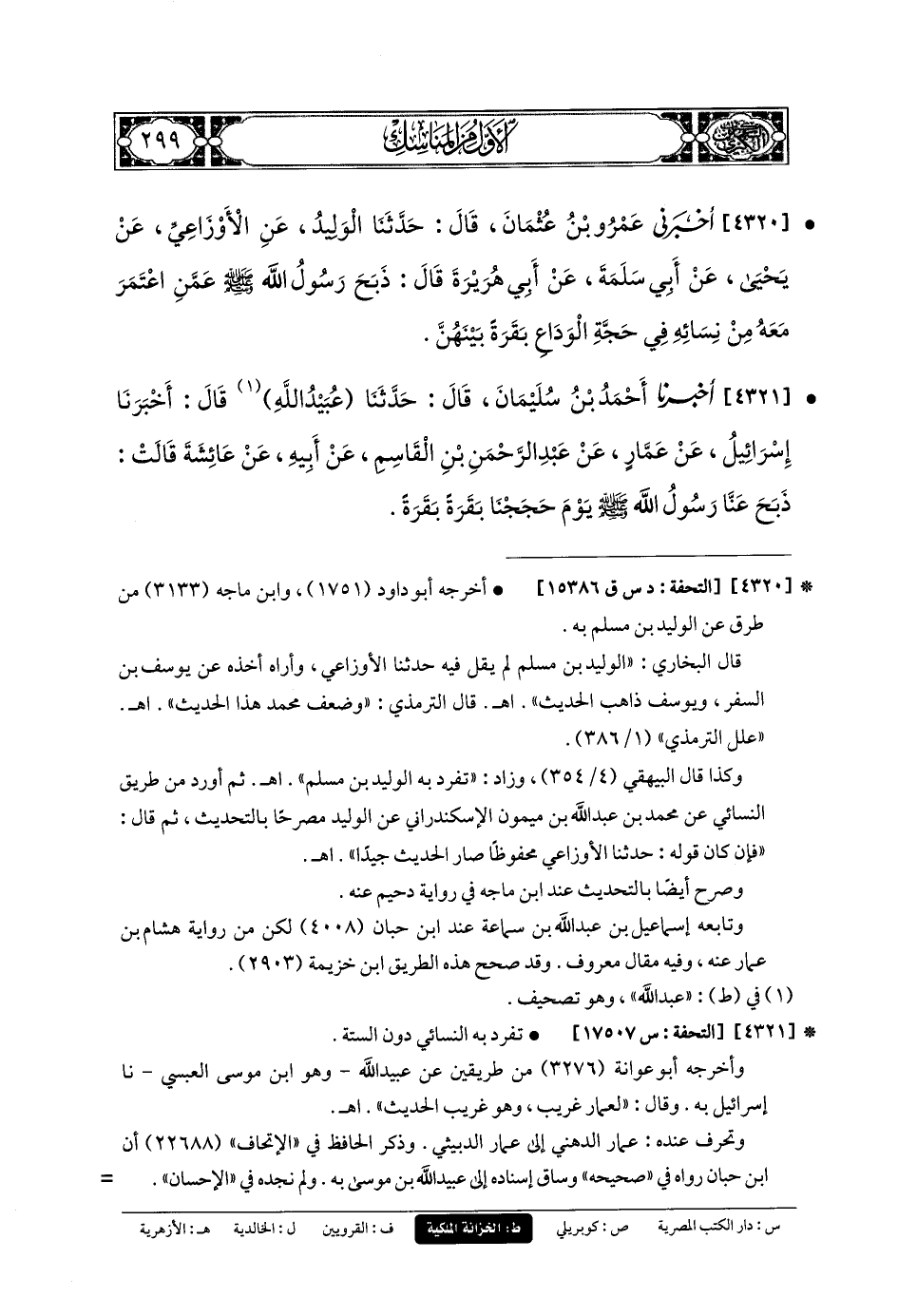 4320- أَخبَرني عَمرُو بنُ عُثْمَانَ، قَالَ: حَدَّثنا الوَلِيدُ، عَنِ الأَوْزَاعِيِّ، عَن يَحيَى، عَن أَبي سَلَمَةَ، عَن أَبي هُرَيرَةَ، قَالَ: ذَبَحَ رَسُولُ اللهِ صَلى الله عَليه وسَلم عَمَّنِ اعْتَمَرَ مَعَهُ مِنْ نِسَائِهِ فِي حَجَّةِ الوَدَاعِ بَقَرَةً بَيْنَهُنَّ.