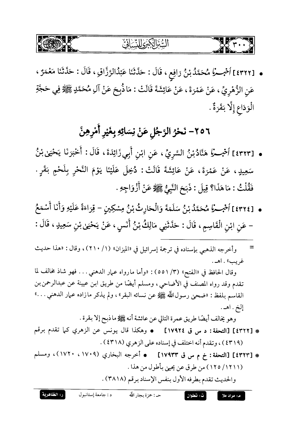 4323- أَخبَرنا هَنَّادُ بنُ السَّرِيِّ، عَنِ ابنِ أَبي زَائِدَةَ، قَالَ: أَخبَرنا يَحيَى بنُ سَعِيدٍ، عَن عَمْرَةَ، عَن عَائِشَةَ، قَالَتْ: دُخِلَ عَلَيْنَا يَوْمَ النَّحْرِ بِلَحْمِ بَقَرٍ، فَقُلْتُ: مَا هَذَا؟ قِيلَ: ذَبَحَ النَّبيُّ صَلى الله عَليه وسَلم عَن أَزْوَاجِهِ.