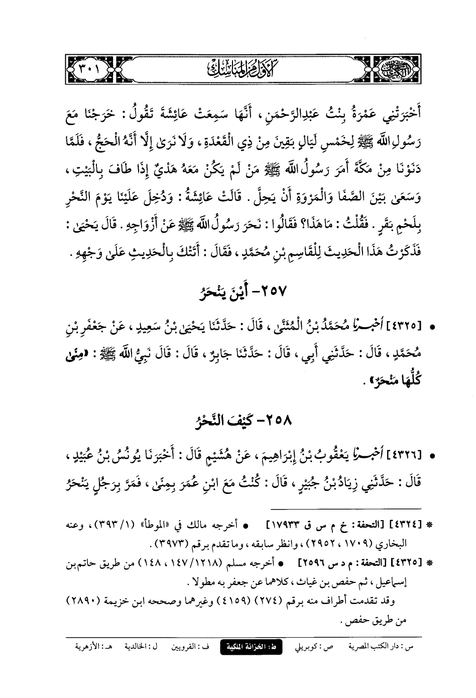 4325- أَخبَرنا مُحَمدُ بنُ المُثَنَّى، قَالَ: حَدَّثنا يَحيَى بنُ سَعِيدٍ، عَن جَعفَرِ بنِ مُحَمدٍ، قَالَ: حَدَّثني أَبي، قَالَ: حَدَّثنا جَابِرٌ قَالَ: قَالَ نَبِيُّ اللهِ صَلى الله عَليه وسَلم: مِنًى كُلُّهَا مَنْحَرٌ.