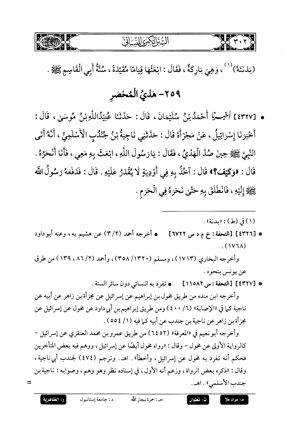 4327- أَخبَرنا أَحْمَدُ بنُ سُلَيمَانَ، قَالَ: حَدَّثنا عُبَيدُ اللهِ بنُ مُوسَى، قَالَ: أَخبَرنا إِسرَائِيلُ، عَن مَجْزَأَةً، قَالَ: حَدَّثني نَاجِيَةُ بنُ جُنْدُبٍ الأَسْلَمِيُّ، أَنَّهُ أَتَى النَّبيَّ صَلى الله عَليه وسَلم حِينَ صُدَّ الهَدْيُ، فَقَالَ: يَا رَسُولَ اللهِ، ابْعَثْ بِهِ مَعِي فَأَنَا أَنْحَرُهُ، قَالَ: وَكَيْفَ؟ قَالَ: آخُذُ بِهِ فِي أَوْدِيَةٍ لا يُقْدَرُ عَلَيْهِ، قَالَ: فَدَفَعَهُ رَسُولُ اللهِ صَلى الله عَليه وسَلم إِلَيْهِ، فَانْطَلَقَ بِهِ حَتَّى نَحَرَهُ فِي الحَرَمِ.