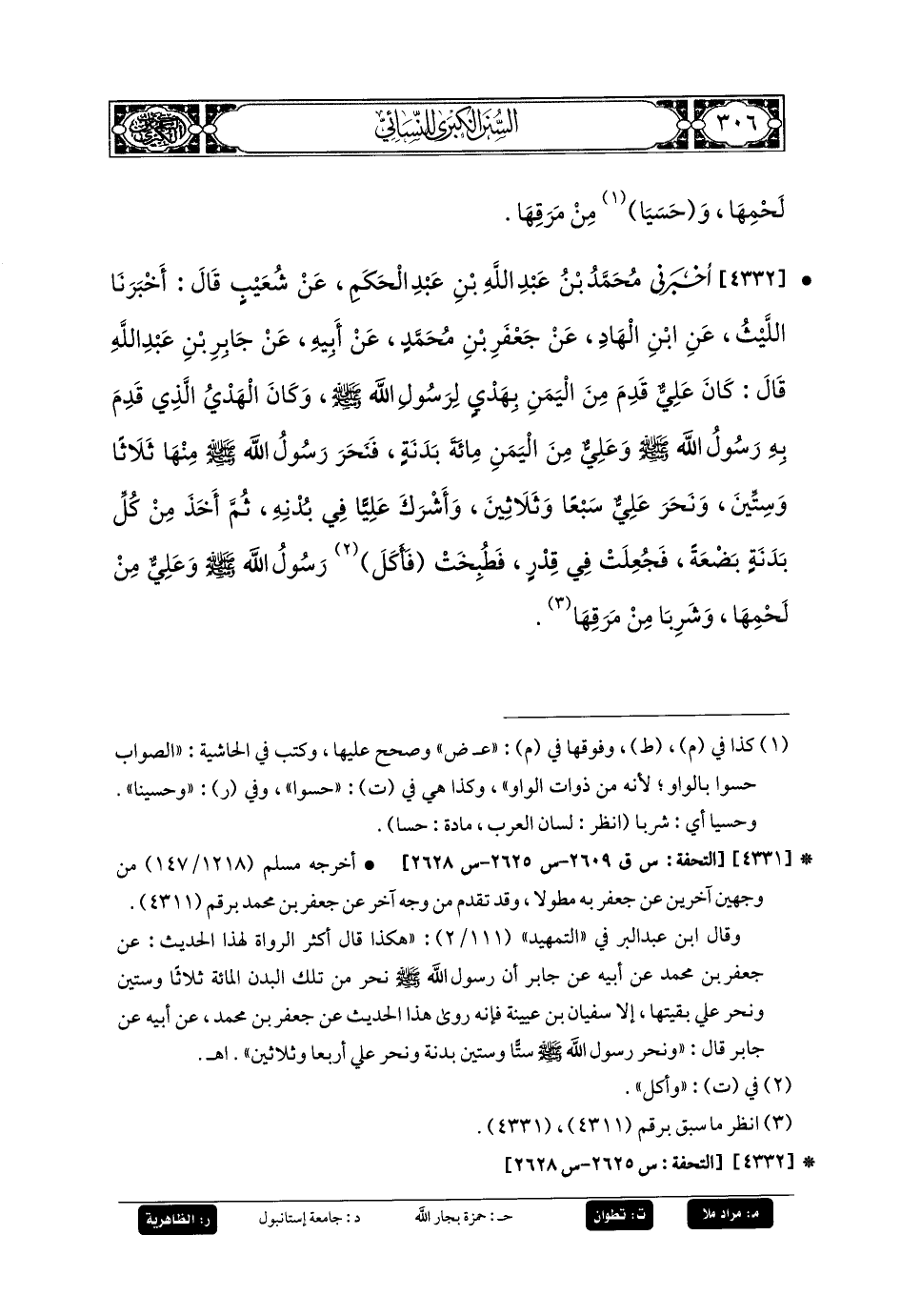 4332- أَخبَرني مُحَمدُ بنُ عَبدِ اللهِ بنِ عَبدِ الحَكَمِ، عَن شُعَيبٍ، قَالَ: أَخبَرنا اللَّيْثُ، عَنِ ابنِ الهَادِ، عَن جَعفَرِ بنِ مُحَمدٍ، عَن أَبيهِ، عَن جَابِرِ بنِ عَبدِ اللهِ، قَالَ: كَانَ عَليٌّ قَدِمَ مِنَ اليَمَنِ بِهَدْيٍ لِرَسُولِ اللهِ صَلى الله عَليه وسَلم، وَكَانَ الهَدْيُ الَّذِي قَدِمَ بِهِ رَسُولُ اللهِ صَلى الله عَليه وسَلم وَعَليٌّ مِنَ اليَمَنِ مِئَةَ بَدَنَةٍ، فَنَحَرَ رَسُولُ اللهِ صَلى الله عَليه وسَلم مِنْهَا ثَلاثًا وَسِتِّينَ، وَنَحَرَ عَليٌّ سَبْعًا وَثَلاثِينَ، وَأَشْرَكَ عَليًّا فِي بُدْنِهِ، ثُمَّ أُخِذَ مِنْ كُلِّ بَدَنَةٍ بَضْعَةً، فَجُعِلَتْ فِي قِدْرٍ فَطُبِخَتْ، فَأَكَلَ رَسُولُ اللهِ صَلى الله عَليه وسَلم وَعَليٌّ مِنْ لَحْمِهَا، وَشَرِبَا مِنْ مَرَقِهَا.
