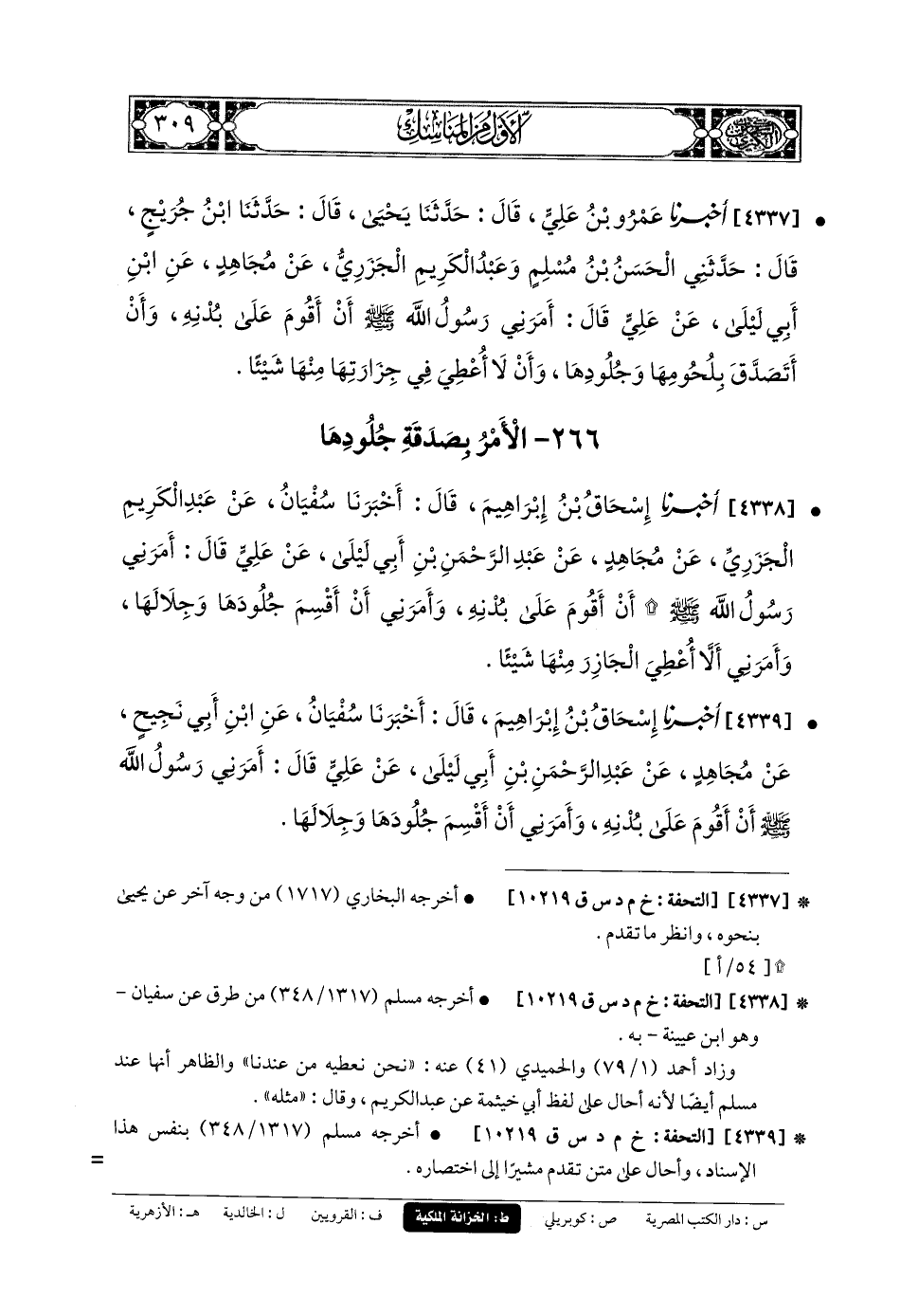 4338- أَخبَرنا إِسحَاقُ بنُ إِبرَاهِيمَ، قَالَ: أَخبَرنا سُفيانُ، عَن عَبدِ الكَرِيمِ الجَزَرِيِّ، عَن مُجَاهِدٍ، عَن عَبدِ الرَّحمَنِ بنِ أَبي لَيْلَى، عَن عَليٍّ، قَالَ: أَمَرَنِي رَسُولُ اللهِ صَلى الله عَليه وسَلم أَنْ أَقُومَ عَلَى بُدْنِهِ، وَأَمَرَنِي أَنْ أَقْسِمَ جُلُودَهَا وَجِلالَهَا، وَأَمَرَنِي أَلا أُعْطِيَ الجَازِرَ مِنْهَا شَيْئًا.