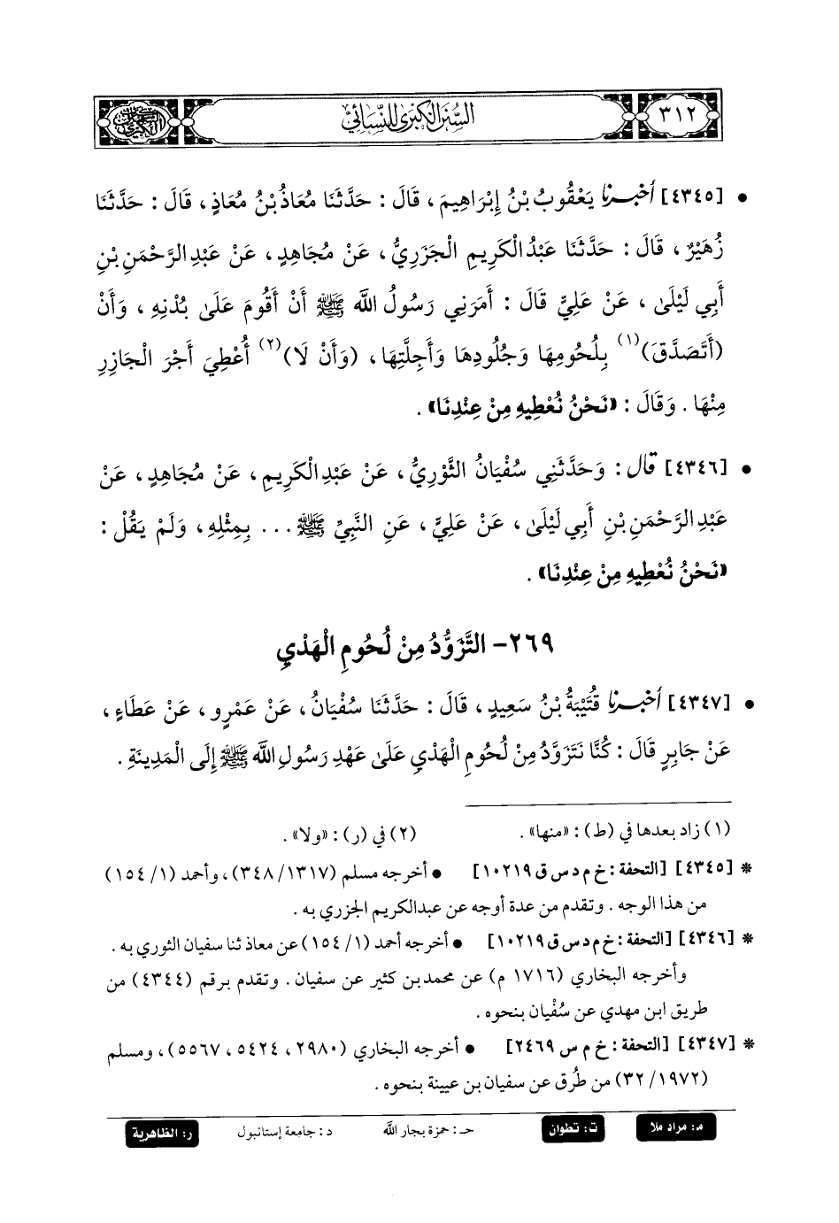 4345- أَخبَرنا يَعقُوبُ بنُ إِبرَاهِيمَ، قَالَ: حَدَّثنا مُعَاذُ بنُ مُعَاذٍ، قَالَ: حَدَّثنا زُهَيْرٌ، قَالَ: حَدَّثنا عَبدُ الكَرِيمِ الجَزَرِيُّ، عَن مُجَاهِدٍ، عَن عَبدِ الرَّحمَنِ بنِ أَبي لَيْلَى، عَن عَليٍّ، قَالَ: أَمَرَنِي رَسُولُ اللهِ صَلى الله عَليه وسَلم أَنْ أَقُومَ عَلَى بُدْنِهِ، وَأَنْ أَتَصَدَّقَ بِلُحُومِهَا وَجُلُودِهَا وَأَجِلَّتِهَا، وَأَنْ لا أُعْطِيَ أَجْرَ الجَازِرِ مِنْهَا، وَقَالَ: نَحْنُ نُعْطِيهِ مِنْ عِنْدِنَا.