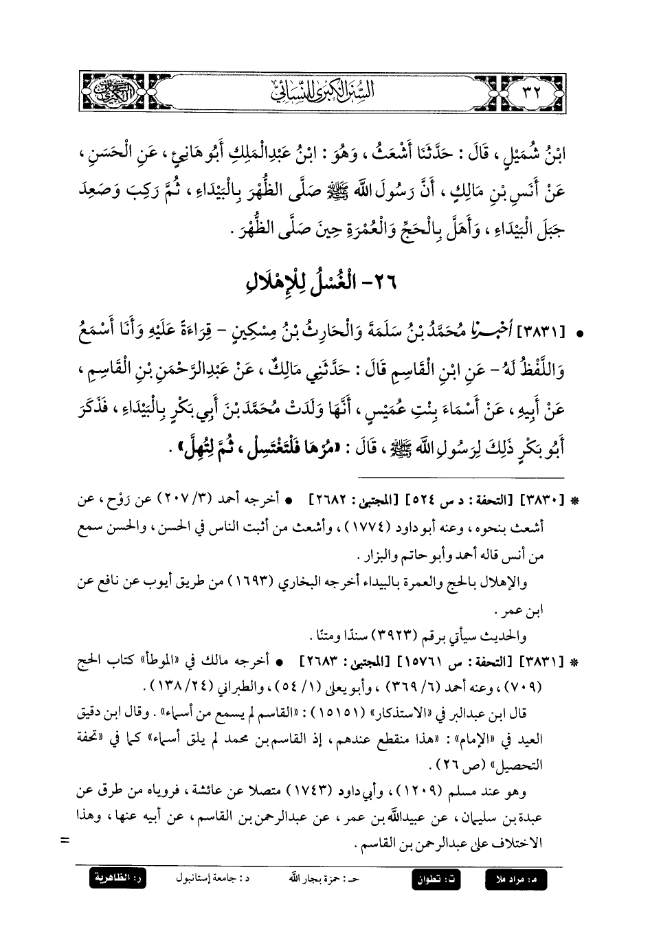 3831- أَخبَرنا مُحَمدُ بنُ سَلَمَةَ، وَالحَارِثُ بنُ مِسْكِينٍ، قِرَاءَةً عَلَيْهِ، وَأَنَا أَسْمَعُ، وَاللَّفْظُ لَهُ، عَنِ ابنِ القَاسِمِ، قَالَ: حَدَّثني مَالِكٌ، عَن عَبدِ الرَّحمَنِ بنِ القَاسِمِ، عَن أَبيهِ، عَن أَسْمَاءَ بِنْتِ عُمَيْسٍ، أَنَّهَا وَلَدَتْ مُحَمدَ بْنَ أَبي بَكْرٍ بِالبَيْدَاءِ، فَذَكَرَ أَبو بَكْرٍ ذَلِكَ لِرَسُولِ اللهِ صَلى الله عَليه وسَلم، قَالَ: مُرْهَا فَلْتَغْتَسِلْ، ثُمَّ لِتُهَلَّ.