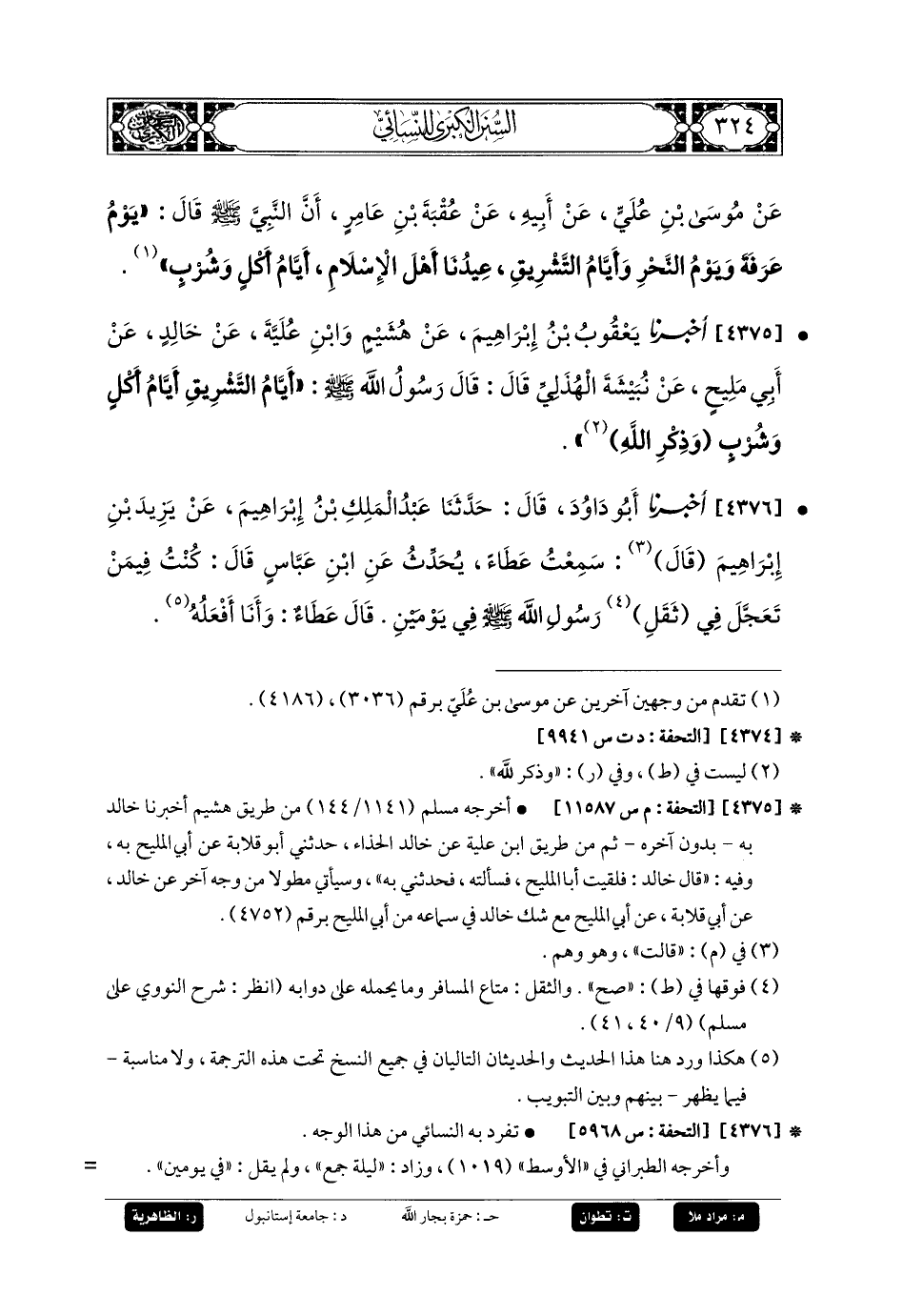 4375- أَخبَرنا يَعقُوبُ بنُ إِبرَاهِيمَ، عَن هُشَيْمٍ، وَابْنِ عُلَيَّةَ، عَن خَالِدٍ، عَن أَبي مَلِيحِ، عَن نُبَيْشَةَ الهُذَلِيِّ، قَالَ: قَالَ رَسُولُ اللهِ صَلى الله عَليه وسَلم: أَيَّامُ التَّشْرِيقِ أَيَّامُ أَكْلٍ وَشُرْبٍ، وَذِكْرِ اللهِ.