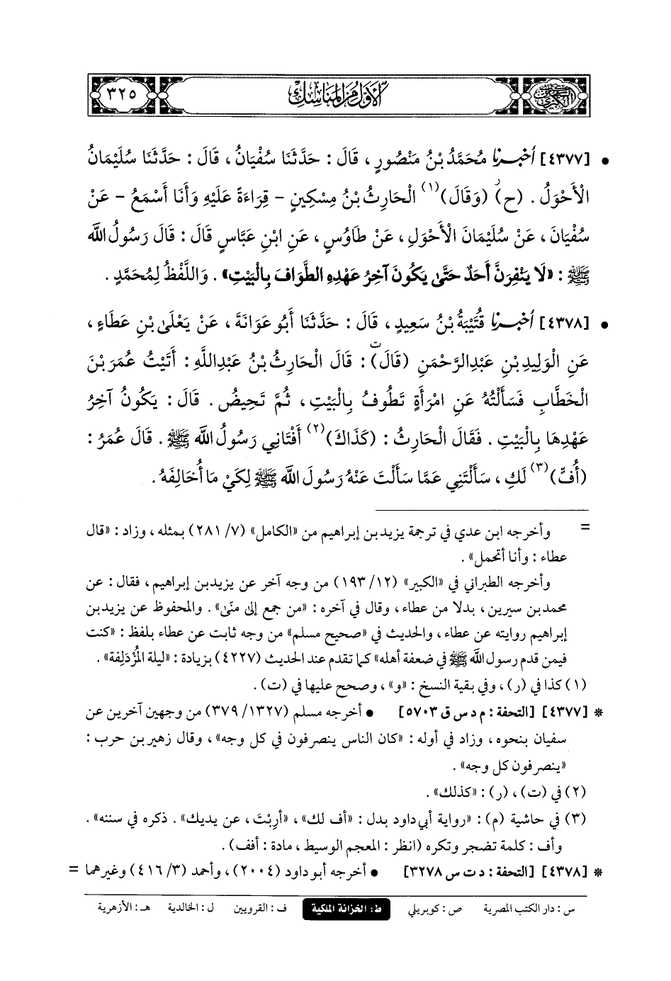 4377- أَخبَرنا مُحَمدُ بنُ مَنْصُورٍ، قَالَ: حَدَّثنا سُفيانُ، قَالَ: حَدَّثنا سُلَيمَانُ الأَحْوَلُ، (ح) وَقال الحَارِثُ بنُ مِسْكِينٍ، قِرَاءَةً عَلَيْهِ، وَأَنَا أَسْمَعُ، عَن سُفيانَ، عَن سُلَيمَانَ الأَحْوَلَ، عَن طَاوُوسٍ، عَنِ ابنِ عَبَّاسٍ، قَالَ: قَالَ رَسُولُ اللهِ صَلى الله عَليه وسَلم: لا يَنْفِرَنَّ أَحَدٌ حَتَّى يَكُونَ آخِرَ عَهْدِهِ الطَّوَافُ بِالبَيْتِ.