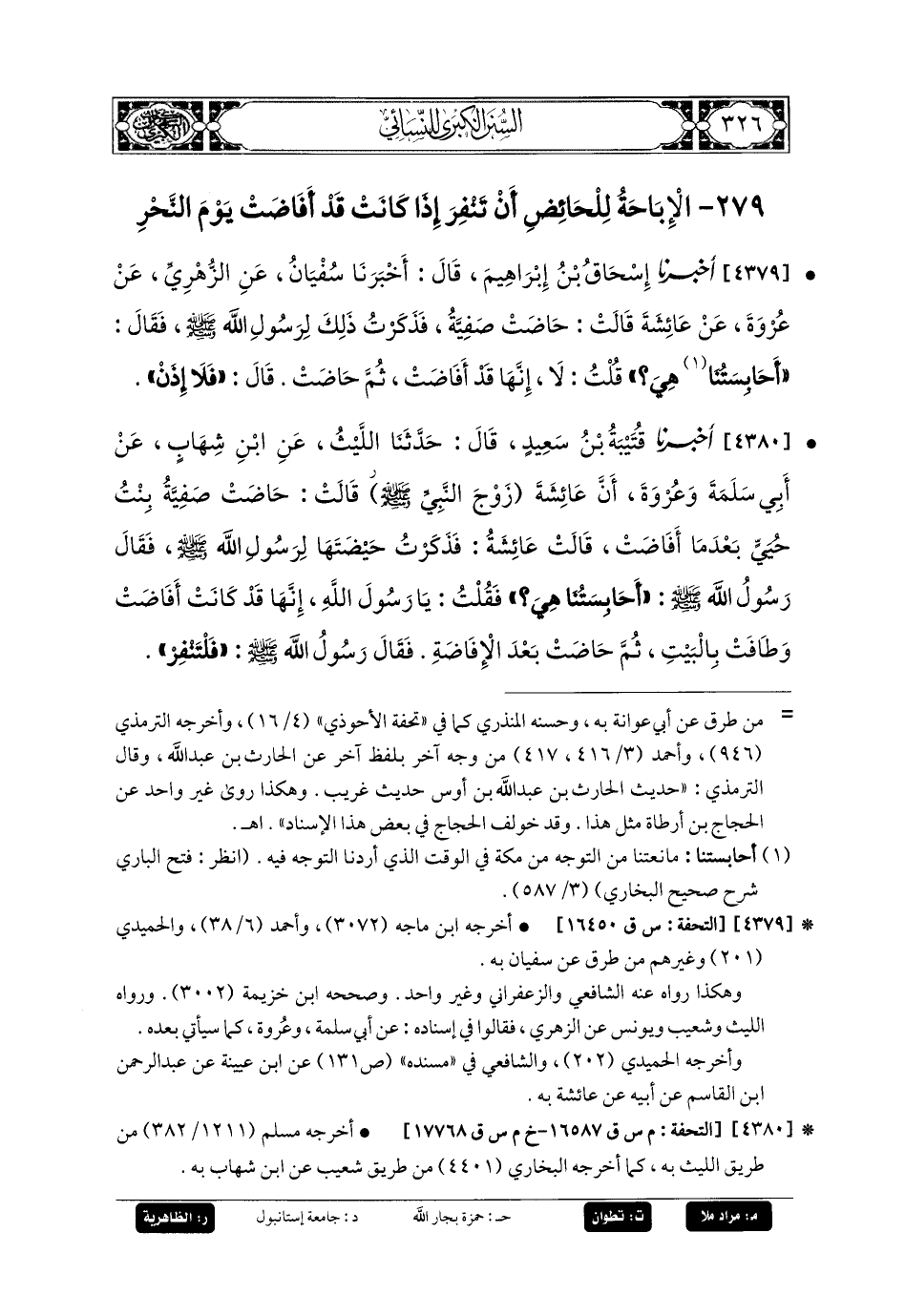 4380- أَخبَرنا قُتَيبَةُ بنُ سَعِيدٍ، قَالَ: حَدَّثنا اللَّيْثُ، عَنِ ابنِ شِهَابٍ، عَن أَبي سَلَمَةَ، وَعُرْوَةَ، أَنَّ عَائِشَةَ زَوْجَ النَّبيِّ صَلى الله عَليه وسَلم، قَالَتْ: حَاضَتْ صَفِيَّةُ بِنْتُ حُيَيٍّ بَعْدَ مَا أَفَاضَتْ، قَالَتْ عَائِشَةُ: فَذَكَرْتُ حَيْضَتَهَا لِرَسُولِ اللهِ صَلى الله عَليه وسَلم، فَقَالَ رَسُولُ اللهِ صَلى الله عَليه وسَلم: أَحَابِسَتُنَا هِيَ؟ فَقُلْتُ: يَا رَسُولَ اللهِ، إِنَّهَا قَدْ كَانَتْ قد أَفَاضَتْ وَطَافَتْ بِالبَيْتِ، ثُمَّ حَاضَتْ بَعْدَ الإِفَاضَةِ، فَقَالَ رَسُولُ اللهِ صَلى الله عَليه وسَلم: فَلْتَنْفِرْ.