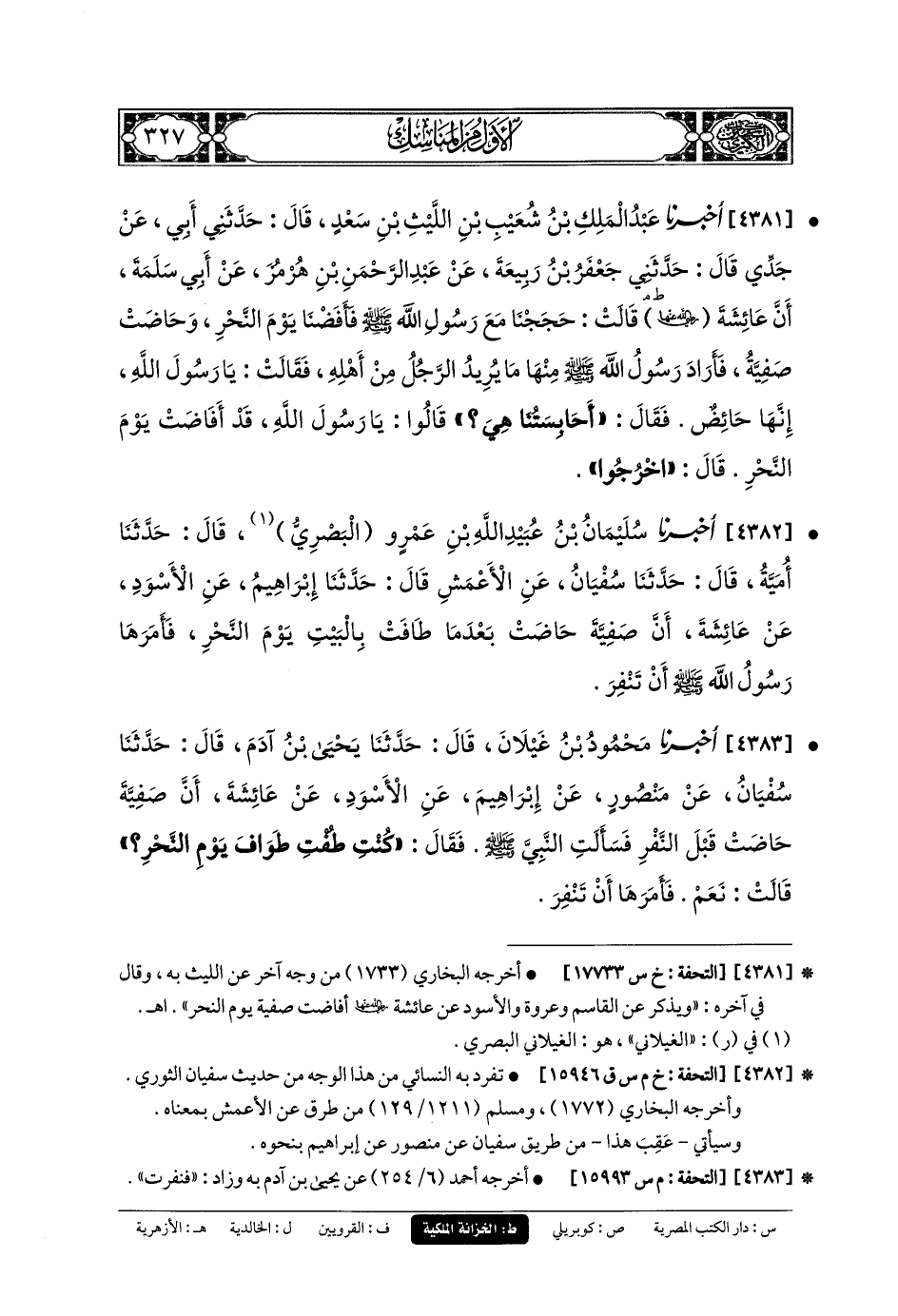 4381- أَخبَرنا عَبدُ المَلِكِ بنُ شُعَيبِ بنِ اللَّيْثِ بنِ سَعْدٍ، قَالَ: حَدَّثني أَبي، عَن جَدِّي، قَالَ: حَدَّثني جَعفَرُ بنُ رَبِيعَةَ، عَن عَبدِ الرَّحمَنِ بنِ هُرْمُزَ، عَن أَبي سَلَمَةَ، أَنَّ عَائِشَةَ رَضِيَ اللهُ عَنهَا، قَالَتْ: حَجَجْنَا مَعَ رَسُولِ اللهِ صَلى الله عَليه وسَلم، فَأَفَضْنَا يَوْمَ النَّحْرِ وَحَاضَتْ صَفِيَّةُ، فَأَرَادَ رَسُولُ اللهِ صَلى الله عَليه وسَلم مِنْهَا مَا يُرِيدُ الرَّجُلُ مِنْ أَهْلِهِ، فَقَالَتْ: يَا رَسُولَ اللهِ، إِنَّهَا حَائِضٌ، فَقَالَ: أَحَابِسَتُنَا هِيَ؟ قَالُوا: يَا رَسُولَ اللهِ، قَدْ أَفَاضَتْ يَوْمَ النَّحْرِ، قَالَ: اخْرُجُوا.