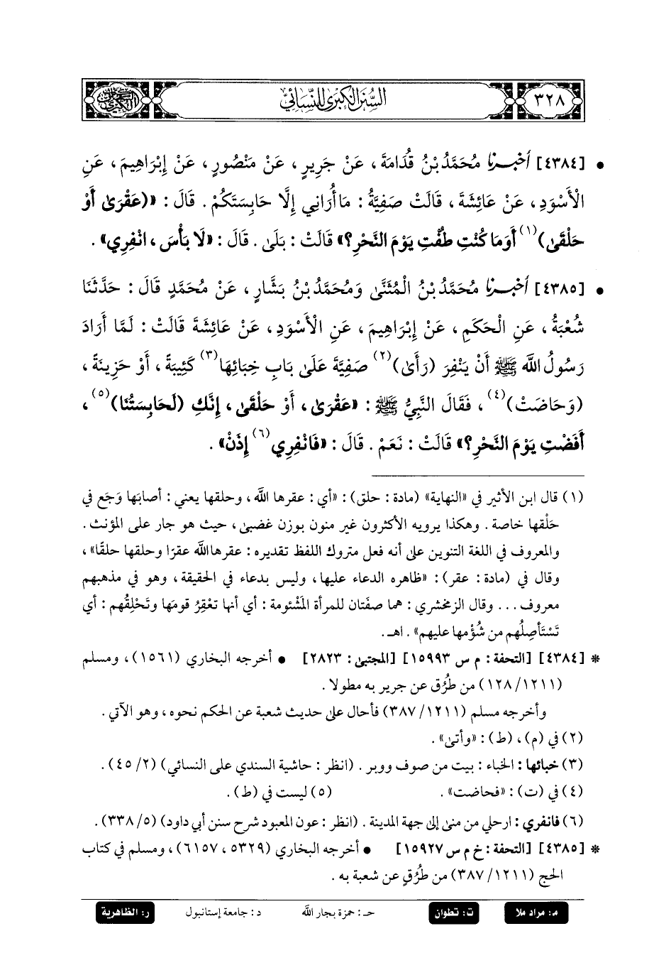 4384- أَخبَرنا مُحَمدُ بنُ قُدَامَةَ، عَن جَرِيرٍ، عَن مَنْصُورٍ، عَن إِبرَاهِيمَ، عَنِ الأَسْوَدِ، عَن عَائِشَةَ، قَالَتْ صَفِيَّةُ: مَا أَرَانِي إِلاَّ حَابِسَتَكُمْ، قَالَ: عَقْرَى أَوْ حَلْقَى، أَوَمَا كُنْتِ طُفْتِ يَوْمَ النَّحْرِ؟ قَالَتْ: بَلَى، قَالَ: لا بَأْسَ، انْفِرِي.