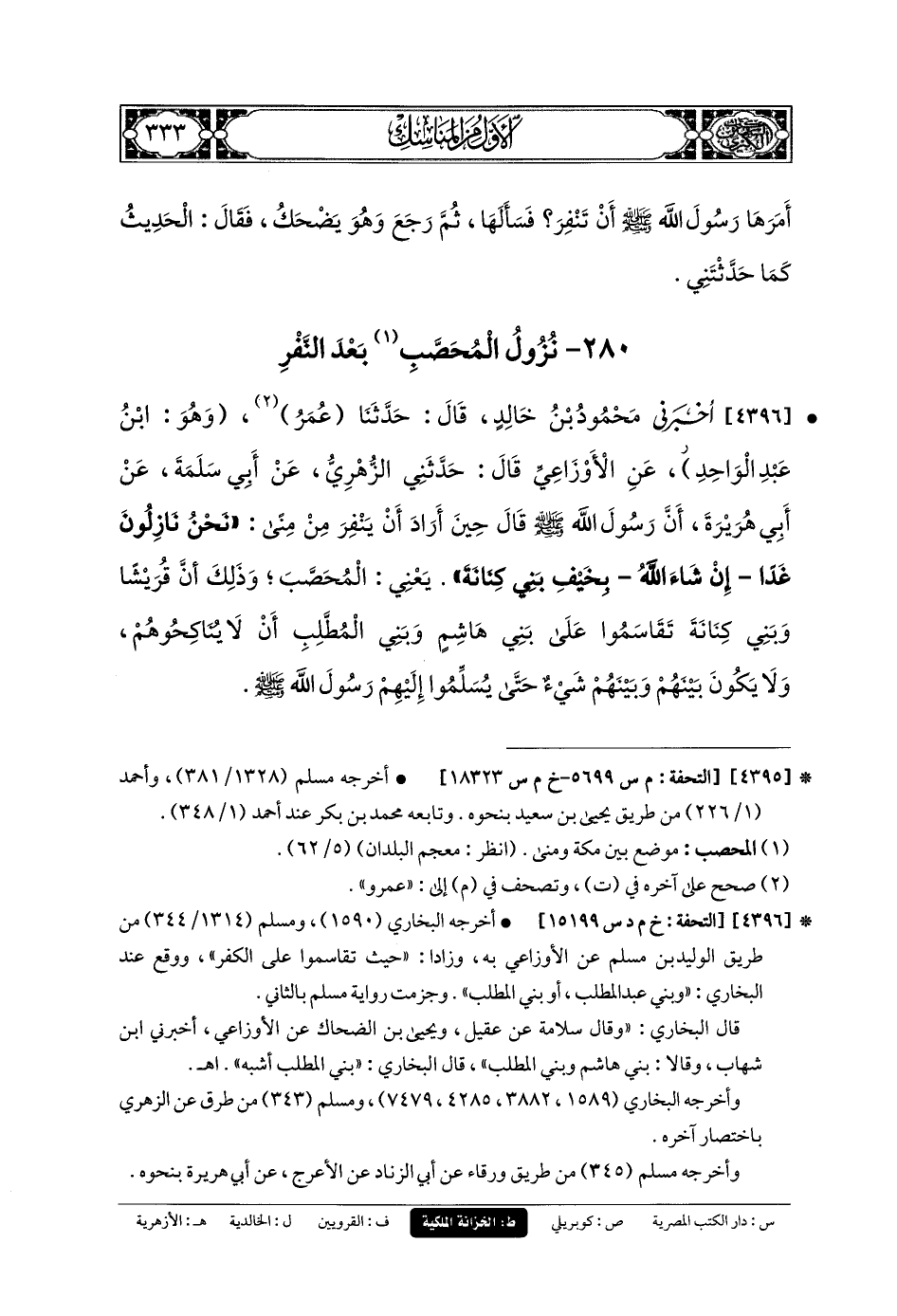 4396- أَخبَرني مَحْمُودُ بنُ خَالِدٍ، قَالَ: حَدَّثنا عُمَرُ، وَهُوَ ابْنُ عَبدِ الوَاحِدِ، عَنِ الأَوْزَاعِيِّ، قَالَ: حَدَّثني الزُّهْرِيُّ، عَن أَبي سَلَمَةَ، عَن أَبي هُرَيرَةَ، أَنَّ رَسُولَ اللهِ صَلى الله عَليه وسَلم قَالَ حِينَ أَرَادَ أَنْ يَنْفِرَ مِنْ مِنًى: نَحْنُ نَازِلُونَ غَدًا إِنْ شَاءَ اللهُ بِخَيْفِ بَنِي كِنَانَةَ، يَعْنِي المُحَصَّبَ، وَذَلِكَ أَنَّ قُرَيْشًا وَبَنِي كِنَانَةَ تَقَاسَمُوا عَلَى بَنِي هَاشِمٍ، وَبَنِي المُطَّلِبِ، أَنْ لا يُنَاكِحُوهُمْ وَلا يَكُونَ بَيْنَهُمْ وَبَيْنَهُمْ شَيْءٌ حَتَّى يُسْلِمُوا إِلَيْهِمْ رَسُولَ اللهِ صَلى الله عَليه وسَلم.