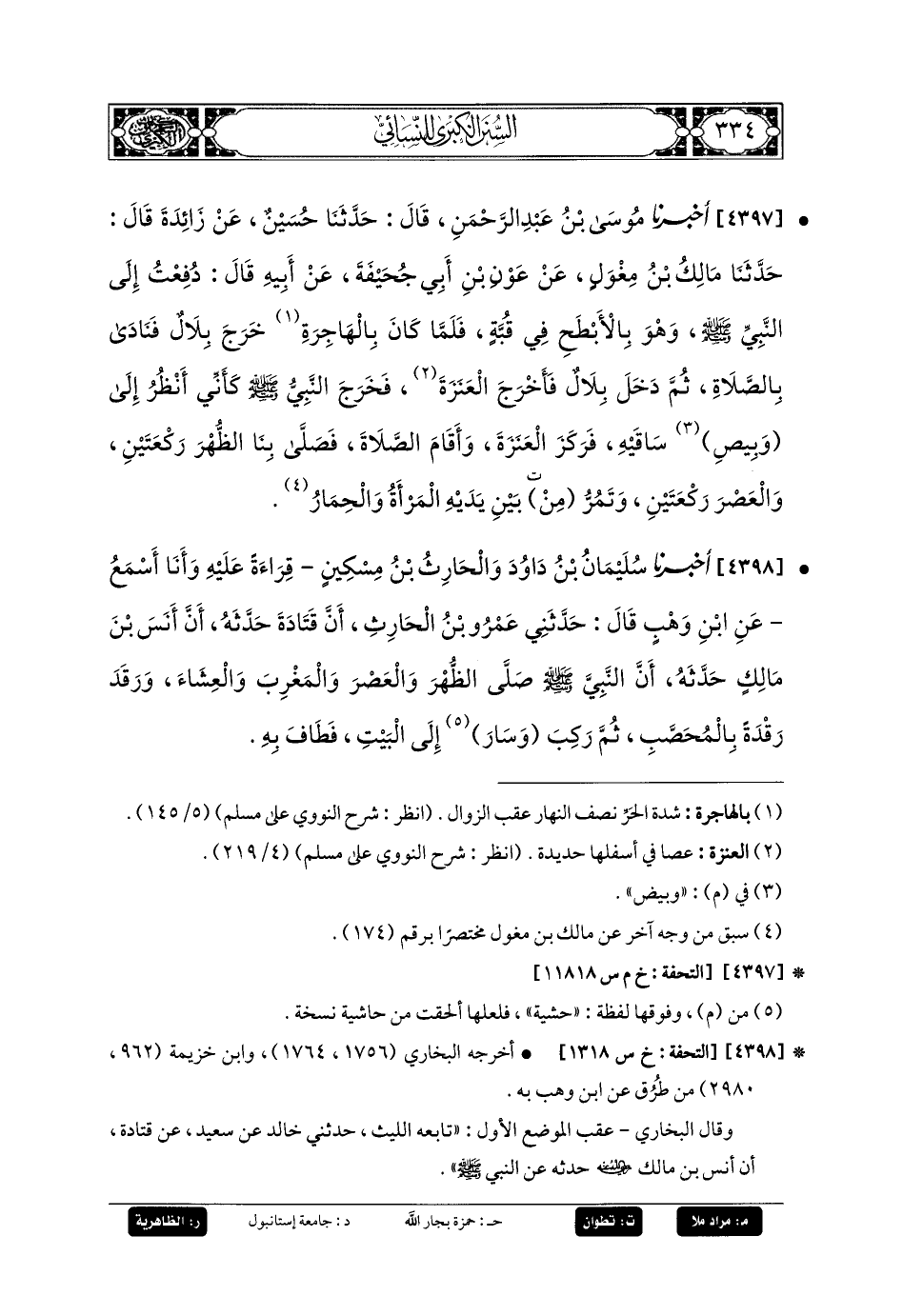 4398- أَخبَرنا سُلَيمَانُ بنُ دَاوُدَ، وَالحَارِثُ بنُ مِسْكِينٍ، قِرَاءَةً عَلَيْهِ، وَأَنَا أَسْمَعُ، عَنِ ابنِ وَهْبٍ، قَالَ: حَدَّثني عَمرُو بنُ الحَارِثِ، أَنَّ قَتَادَةَ حَدَّثَهُ، أَنَّ أَنَسَ بْنَ مَالِكٍ حَدَّثَهُ، أَنَّ النَّبيَّ صَلى الله عَليه وسَلم صَلَّى الظُّهْرَ، وَالعَصْرَ، وَالمَغْرِبَ، وَالعِشَاءَ، وَرَقَدَ رَقْدَةً بِالمُحَصَّبِ، ثُمَّ رَكِبَ وَسَارَ إِلَى البَيْتِ فَطَافَ بِهِ.