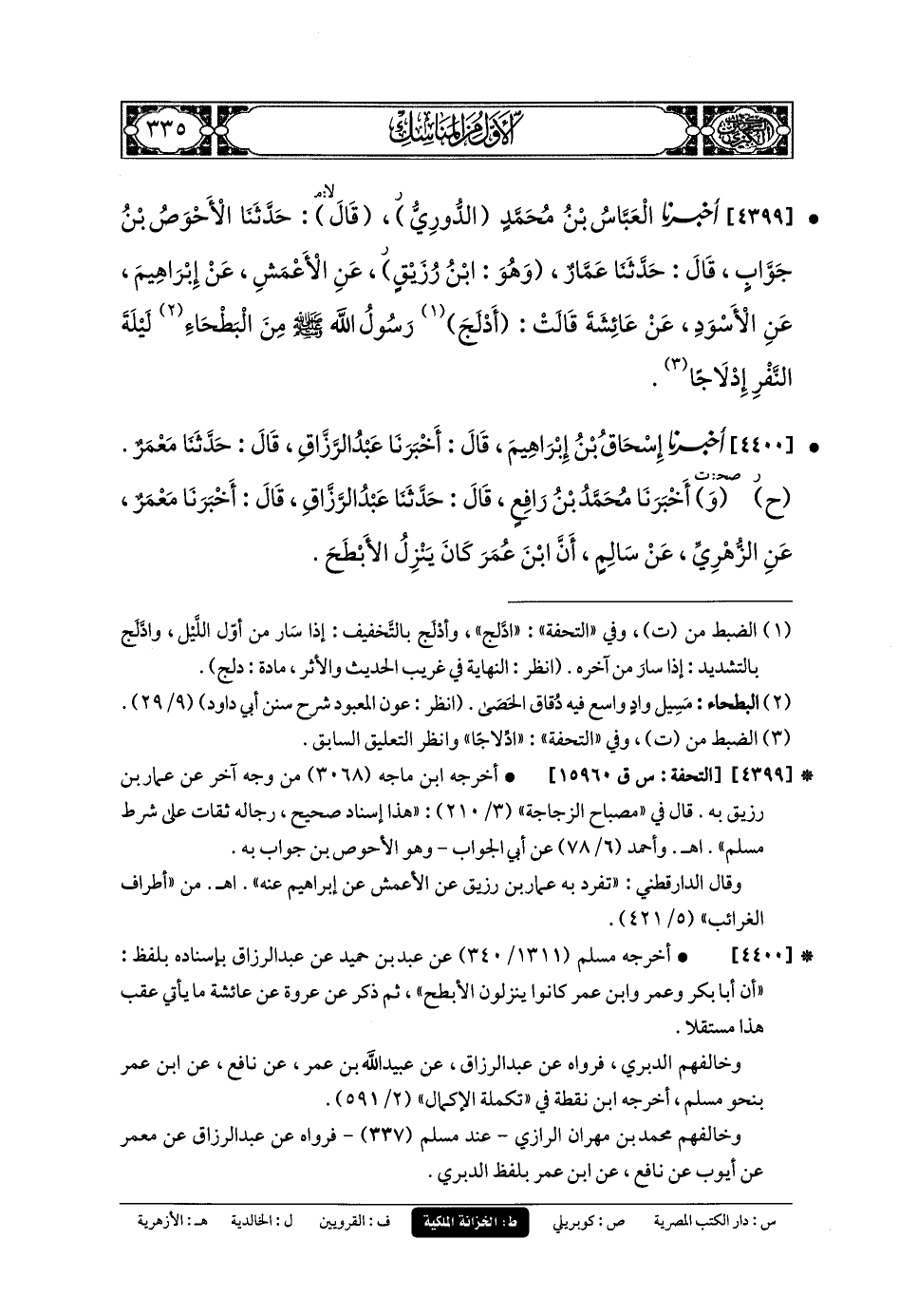 4399- أَخبَرنا العَبَّاسُ بنُ مُحَمدٍ الدُّورِيُّ، قَالَ: حَدَّثنا الأَحْوَصُ بنُ جَوَّابٍ، قَالَ: حَدَّثنا عَمَّارٌ، وَهُوَ ابْنُ رُزَيْقٍ، عَنِ الأَعْمَشِ، عَن إِبرَاهِيمَ، عَنِ الأَسْوَدِ، عَن عَائِشَةَ، قَالَتْ: أَدْلَجَ رَسُولُ اللهِ صَلى الله عَليه وسَلم مِنَ البَطْحَاءِ لَيْلَةَ النَّفْرِ إِدْلاجًا.