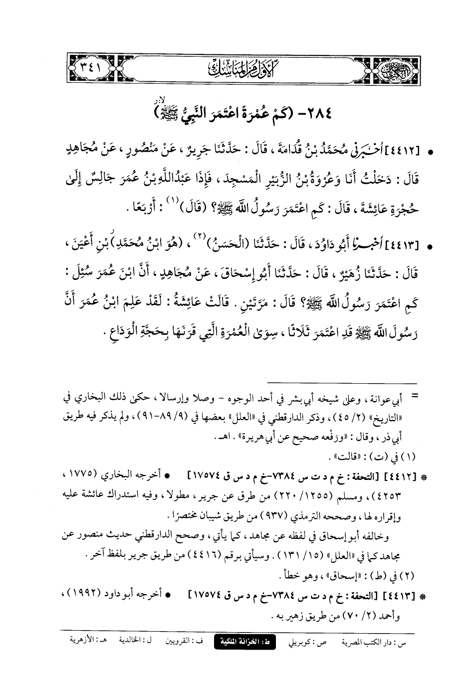 4412- أَخبَرني مُحَمدُ بنُ قُدَامَةَ، قَالَ: حَدَّثنا جَرِيرٌ، عَن مَنْصُورٍ، عَن مُجَاهِدٍ، قَالَ: دَخَلْتُ أَنَا وَعُرْوَةُ بنُ الزُّبَيْرِ المَسْجِدَ، فَإِذَا عَبدُ اللهِ بنُ عُمَرَ جَالِسٌ إِلَى حُجْرَةِ عَائِشَةَ، قَالَ: كَمِ اعْتَمَرَ رَسُولُ اللهِ صَلى الله عَليه وسَلم؟ قَالَ: أَرْبَعًا.