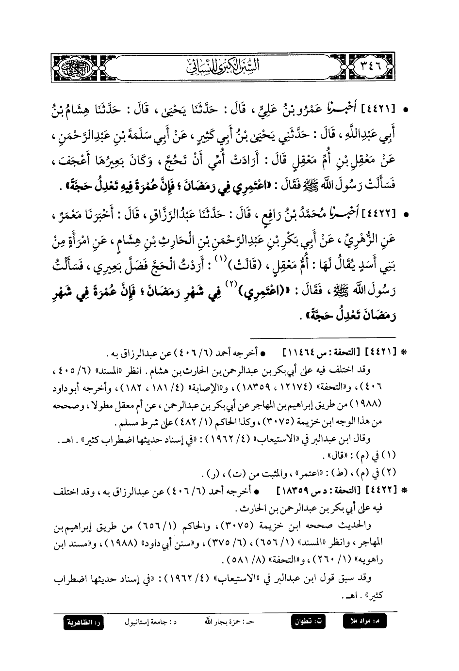 4422- أَخبَرنا مُحَمدُ بنُ رَافِعٍ، قَالَ: حَدَّثنا عَبدُ الرَّزَّاقِ، قَالَ: أَخبَرنا مَعْمَرٌ، عَنِ الزُّهْرِيِّ، عَن أَبي بَكْرِ بنِ عَبدِ الرَّحمَنِ بنِ الحَارِثِ بنِ هِشَامٍ، عَنِ امْرَأَةٍ مِنْ بَنِي أَسَدٍ، يُقَالُ لَهَا: أُمُّ مَعْقِلٍ، قَالَتْ: أَرَدْتُ الحَجَّ فَضَلَّ بَعِيرِي، فَسَأَلْتُ رَسُولَ اللهِ صَلى الله عَليه وسَلم، فَقَالَ: اعْتَمِرِي فِي شَهْرِ رَمَضَانَ، فَإِنَّ عُمْرَةً فِي شَهْرِ رَمَضَانَ تَعْدِلُ حَجَّةً.