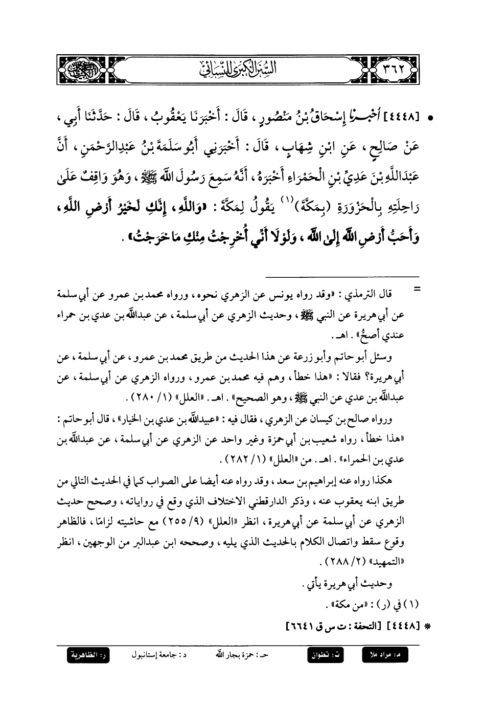 4448- أَخبَرنا إِسحَاقُ بنُ مَنْصُورٍ، قَالَ: أَخبَرنا يَعقُوبُ، قَالَ: حَدَّثنا أَبي، عَن صَالِحٍ، عَنِ ابنِ شِهَابٍ، قَالَ: أَخبَرني أَبو سَلَمَةَ بنُ عَبدِ الرَّحمَنِ، أَنَّ عَبدَ اللهِ بْنَ عَدِيِّ ابنِ الحَمْرَاءِ أَخبَرَهُ، أَنَّهُ سَمِعَ رَسُولَ اللهِ صَلى الله عَليه وسَلم وَهُوَ وَاقِفٌ عَلَى رَاحِلَتِهِ بِالحَزْوَرَةِ بِمَكَّةَ، يَقُولُ لِمَكَّةَ: وَاللهِ إِنَّكِ لَخَيْرُ أَرْضِ اللهِ، وَأَحَبُّ أَرْضِ اللهِ إِلَى اللهِ، وَلَوْلا أَنِّي أُخْرِجْتُ مِنْكِ مَا خَرَجْتُ.