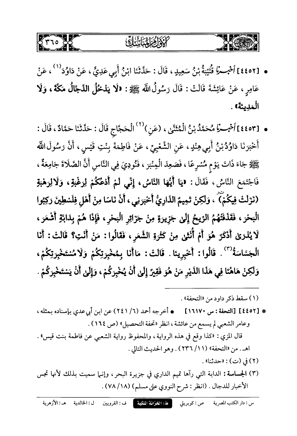 4453- أَخبَرنا مُحَمدُ بنُ المُثَنَّى، عَنِ الحَجَّاجِ، قَالَ: حَدَّثنا حَمَّادٌ، قَالَ: أَخبَرنا دَاوُدُ بنُ أَبي هِنْدٍ، عَنِ الشَّعْبِيِّ، عَن فَاطِمَةَ بِنْتِ قَيسٍ، أَنَّ رَسُولَ اللهِ صَلى الله عَليه وسَلم جَاءَ ذَاتَ يَوْمٍ مُسْرِعًا، فَصَعِدَ المِنْبَرَ، فَنُودِيَ فِي النَّاسِ أَنَّ الصَّلاةَ جَامِعَةً، فَاجْتَمَعَ النَّاسُ، قَالَ: يَا أَيُّهَا النَّاسُ إِنِّي لَمْ أَدْعُكُمْ لِرَغْبَةٍ وَلا لِرَهْبَةٍ نَزَلَتْ فِيكُمْ، وَلَكِنَّ تَمِيمٌ الدَّارِيُّ أَخبَرني أَنَّ نَاسًا مِنْ أَهْلِ فِلَسْطِينَ رَكِبُوا البَحْرَ، فَقَذَفَتْهُمُ الرِّيحُ إِلَى جَزِيرَةٍ مِنْ جَزَائِرِ البَحْرِ، فَإِذَا هُمْ بِدَابَّةٍ أَشْعَرَ، لا يُدْرَى أَذَكَرٌ هُوَ أَمْ أُنْثَى؟ مِنْ كَثْرَةِ الشَّعْرِ، فَقَالُوا: مَنْ أَنْتِ؟ قَالَتْ: أَنَا الجَسَّاسَةُ، قَالُوا: أَخْبِرِينَا، قَالَتْ: مَا أَنَا بِمُخْبِرَتِكُمْ وَلا مُسْتَخْبِرَتِكُمْ، وَلَكِنْ هَاهُنَا فِي الدَّيْرِ مَنْ هُوَ فَقِيرٌ إِلَى أَنْ يُخْبِرَكُمْ، وَإِلَى أَنْ يَسْتَخْبِرَكُمْ، فَأَتَوَا الدَّيْرَ، فَإِذَا هُمْ بِرَجُلٍ ضَرِيرٍ مُصَفَّدٍ فِي الحَدِيدِ، فَقَالَ: مَنْ أَنْتُمْ؟ قَالُوا: نَحْنُ العَرَبُ، قَالَ: هَلْ بُعِثَ النَّبيُّ؟ قَالُوا: نَعَمْ، قَالَ: فَهَلِ اتَّبَعَتْهُ العَرَبُ؟ قَالُوا: نَعَمْ، قَالَ ذَاكَ خَيْرٌ لَهُمْ، ثُمَّ قَالَ، مَا فَعَلَتْ فَارِسُ؟ قَالُوا: لَمْ يَظْهَرْ عَلَيْهَا بَعْدُ، قَالَ: أَمَا إِنَّهُ سَيَظْهَرُ عَلَيْهَا، ثُمَّ قَالَ: مَا فَعَلَتْ عَيْنُ زُغَرَ، قَالُوا: تَدْفَقُ مَلأَى، قَالَ: فَمَا فَعَلَتْ بُحَيْرَةُ الطَّبَرِيَّةِ؟ قَالُوا: هِيَ تَدْفَقُ مَلأَى، قَالَ: فَمَا فَعَلَ نَخْلُ بَيْسَانَ؟ قَالُوا: قَدْ أَطْعَمَ أَوَائِلُهُ، فَوَثَبَ وَثْبَةً حَتَّى خَشِينَا أَنَّهُ يَنْقلِب، فَقُلْنَا: مَنْ أَنْتَ؟ قَالَ: أَنَا الدَّجَّالُ، قَالَ: أَمَا إِنِّي سَأَطَأُ الأَرْضَ كُلَّهَا، إِلاَّ مَكَّةَ وَطَيْبَةَ، فَقَالَ النَّبيُّ صَلى الله عَليه وسَلم: فَأَبْشِرُوا مَعْشَرَ المُسْلِمِينَ هَذِهِ طَيْبَةُ لا يَدْخُلُهَا.