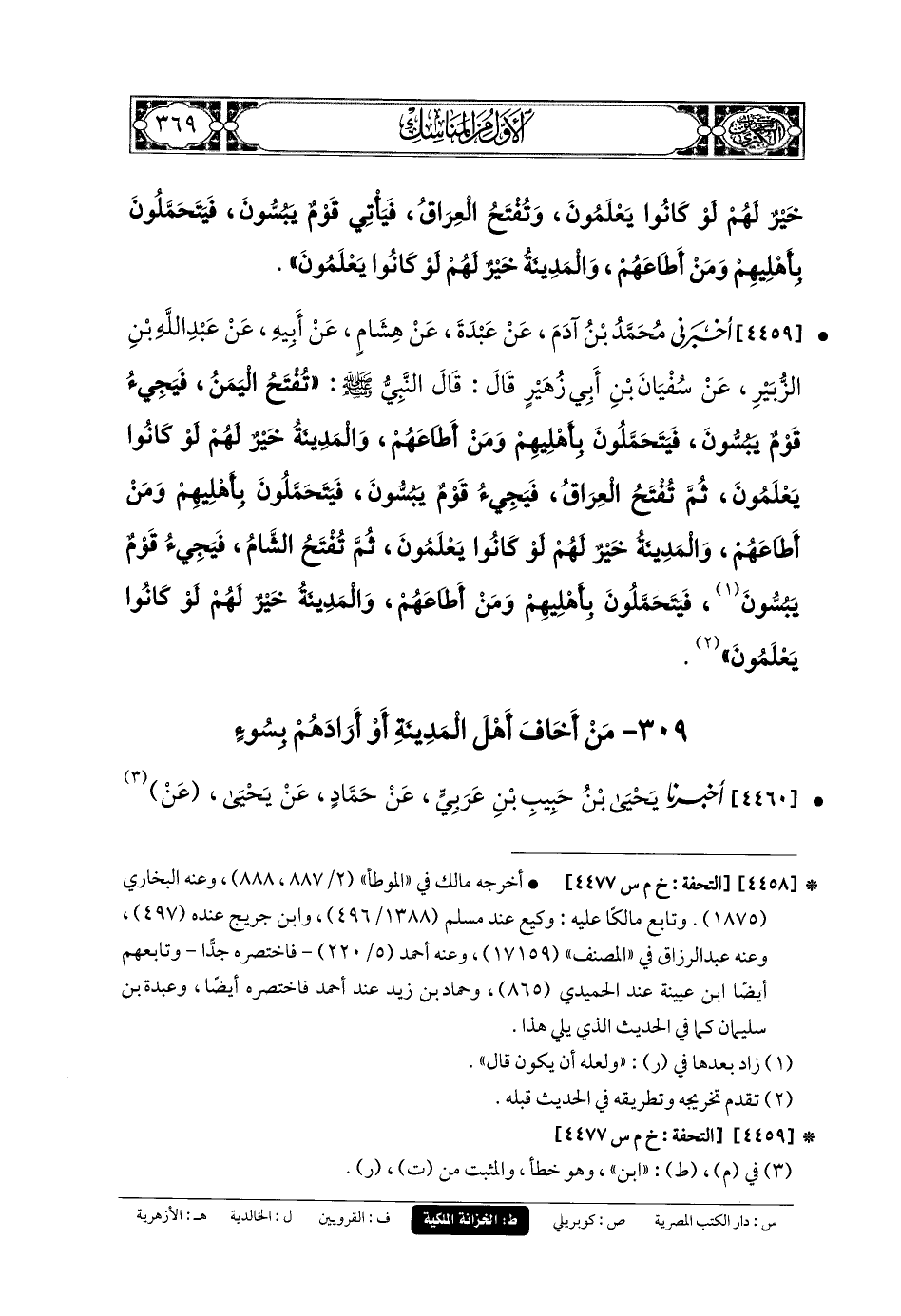 4459- أَخبَرني مُحَمدُ بنُ آدَمَ، عَن عَبدَةَ، عَن هِشَامٍ، عَن أَبيهِ، عَن عَبدِ اللهِ بنِ الزُّبَيْرِ، عَن سُفيانَ بنِ أَبي زُهَيْرٍ قَالَ: قَالَ النَّبيُّ صلى الله عليه وسلم: تُفْتَحُ اليَمَنُ، فَيَجِيءُ قَوْمٌ يَبُسُّونَ فَيَتَحَمَّلُونَ بِأَهْلِيهِمْ وَمَنْ أَطَاعَهُمْ، وَالمَدِينَةُ خَيْرٌ لَهُمْ لَوْ كَانُوا يَعْلَمُونَ، ثُمَّ تُفْتَحُ العِرَاقُ، فَيَجِيءُ قَوْمٌ يَبُسُّونَ فَيَتَحَمَّلُونَ بِأَهْلِيهِمْ وَمَنْ أَطَاعَهُمْ، وَالمَدِينَةُ خَيْرٌ لَهُمْ لَوْ كَانُوا يَعْلَمُونَ، ثُمَّ تُفْتَحُ الشَّامُ، فَيَجِيءُ قَوْمٌ يَبُسُّونَ فَيَتَحَمَّلُونَ بِأَهْلِيهِمْ وَمَنْ أَطَاعَهُمْ، وَالمَدِينَةُ خَيْرٌ لَهُمْ لَوْ كَانُوا يَعْلَمُونَ.