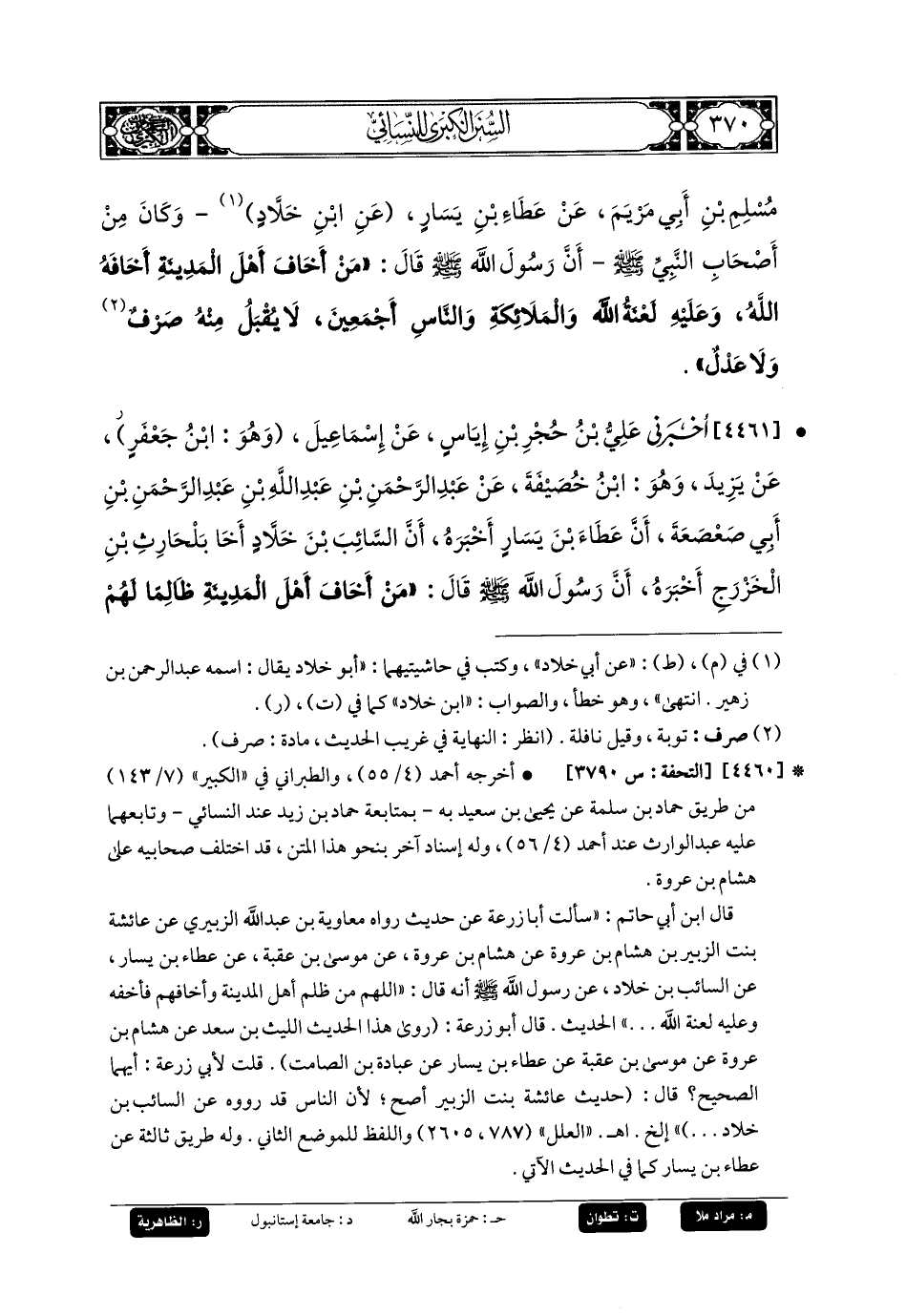 4461- أَخبَرني عَليُّ بنُ حُجْرِ بنِ إِيَاسٍ، عَن إِسمَاعِيلَ، وَهُوَ ابْنُ جَعفَرٍ، عَن يَزِيدَ، وَهُوَ ابْنُ خُصَيْفَةَ، عَن عَبدِ الرَّحمَنِ بنِ عَبدِ اللهِ بنِ عَبدِ الرَّحمَنِ بنِ أَبي صَعْصَعَةَ، أَنَّ عَطَاءَ بْنَ يَسَارٍ أَخبَرَهُ، أَنَّ السَّائِبَ بْنَ خَلاَّدٍ أَخَا بَلْحَارِثِ بنِ الخَزْرَجِ أَخبَرَهُ؛ أَنَّ رَسُولَ اللهِ صَلى الله عَليه وسَلم قَالَ: مَنْ أَخَافَ أَهْلَ المَدِينَةِ ظَالِمًا لَهُمْ أَخَافُهُ اللهُ، وَكَانَتْ عَلَيْهِ لَعْنَةُ اللهِ وَالمَلائِكَةِ وَالنَّاسِ أَجْمَعِينَ، لا يُقْبَلُ مِنْهُ صَرْفٌ وَلا عَدْلٌ.