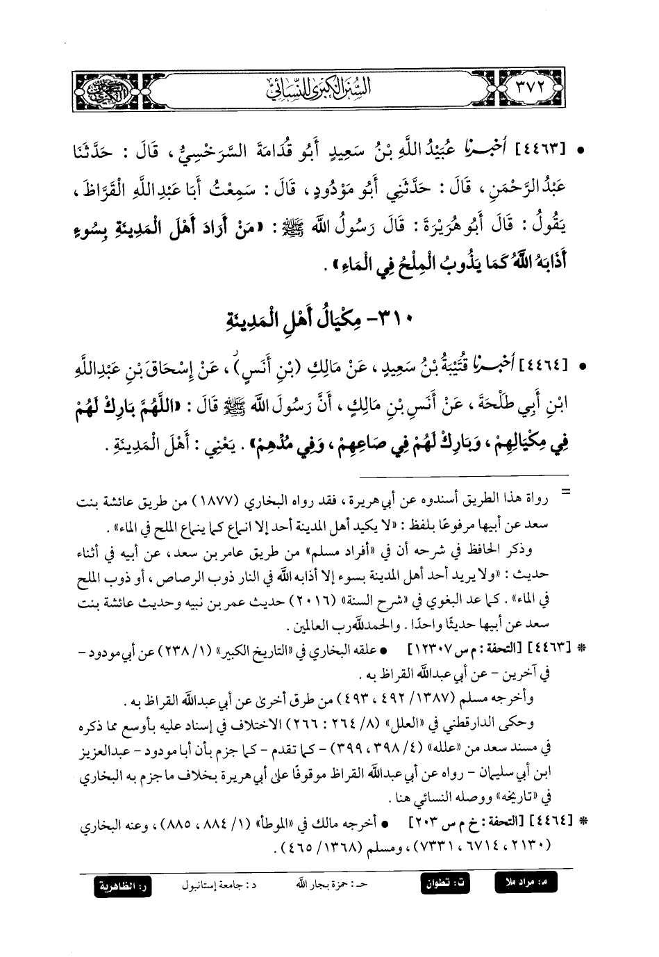 4463- أَخبَرنا عُبَيدُ اللهِ بنُ سَعِيدٍ أَبو قُدَامَةَ السَّرَخْسِيُّ، قَالَ: حَدَّثنا عَبدُ الرَّحمَنِ، قَالَ: حَدَّثني أَبو مَوْدُودٍ، قَالَ: سَمِعْتُ أَبَا عَبدِ اللهِ القَرَّاظَ، يَقُولُ: قَالَ أَبو هُرَيرَةَ: قَالَ رَسُولُ اللهِ صَلى الله عَليه وسَلم: مَنْ أَرَادَ أَهْلَ المَدِينَةِ بِسُوءٍ أَذَابَهُ اللهُ كَمَا يَذُوبُ المِلْحُ فِي المَاءِ.