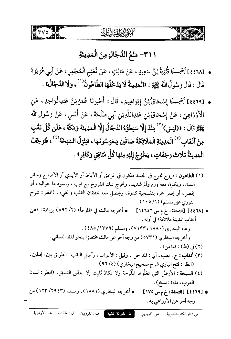4468- أَخبَرنا قُتَيبَةُ بنُ سَعِيدٍ، عَن مَالِكٍ، عَن نُعَيْمٍ المُجْمِرِ، عَن أَبي هُرَيرَةَ قَالَ: قَالَ رَسُولُ اللهِ صَلى الله عَليه وسَلم: المَدِينَةُ لا يَدْخُلُهَا الطَّاعُونُ وَلا الدَّجَّالُ.